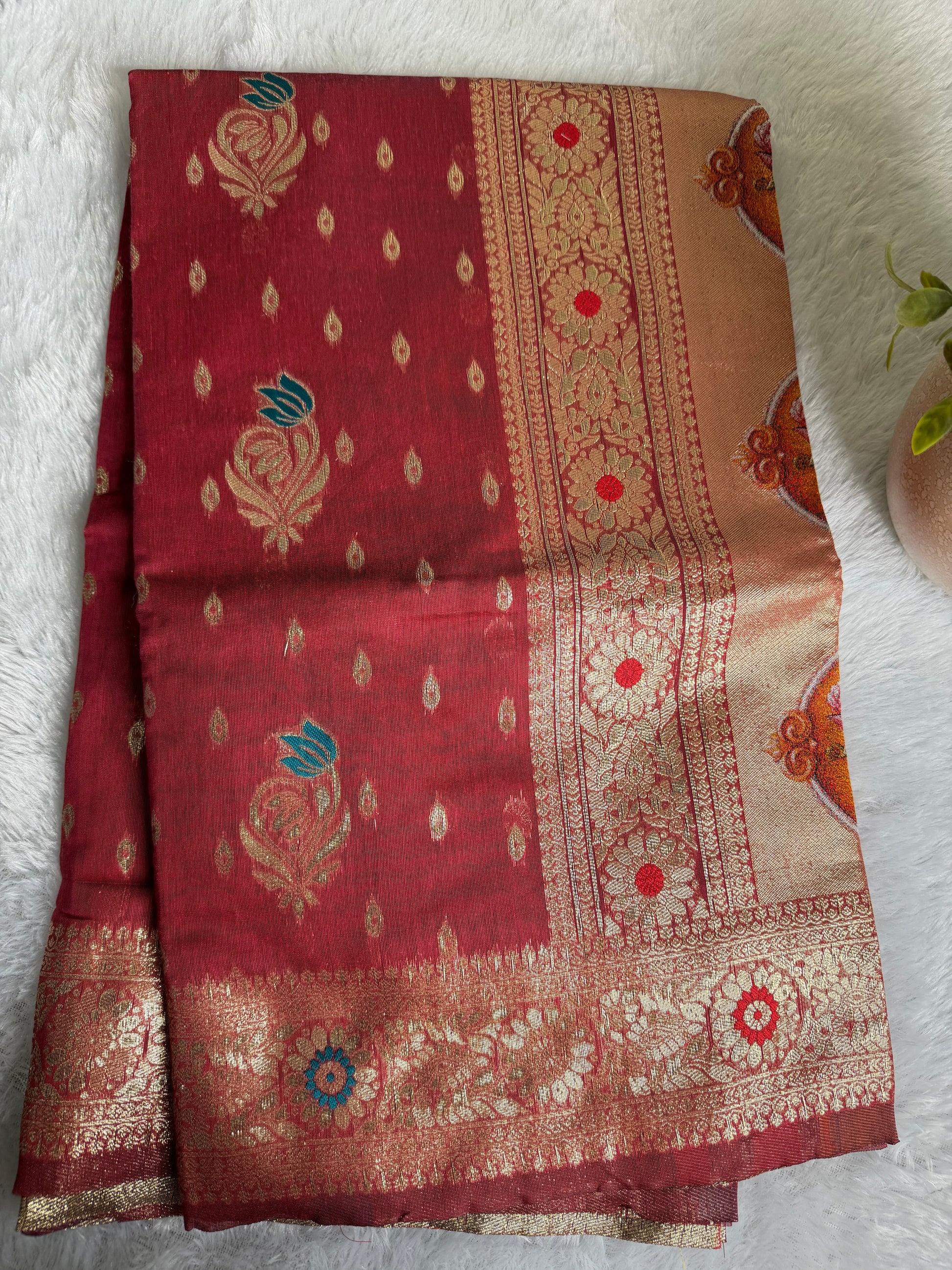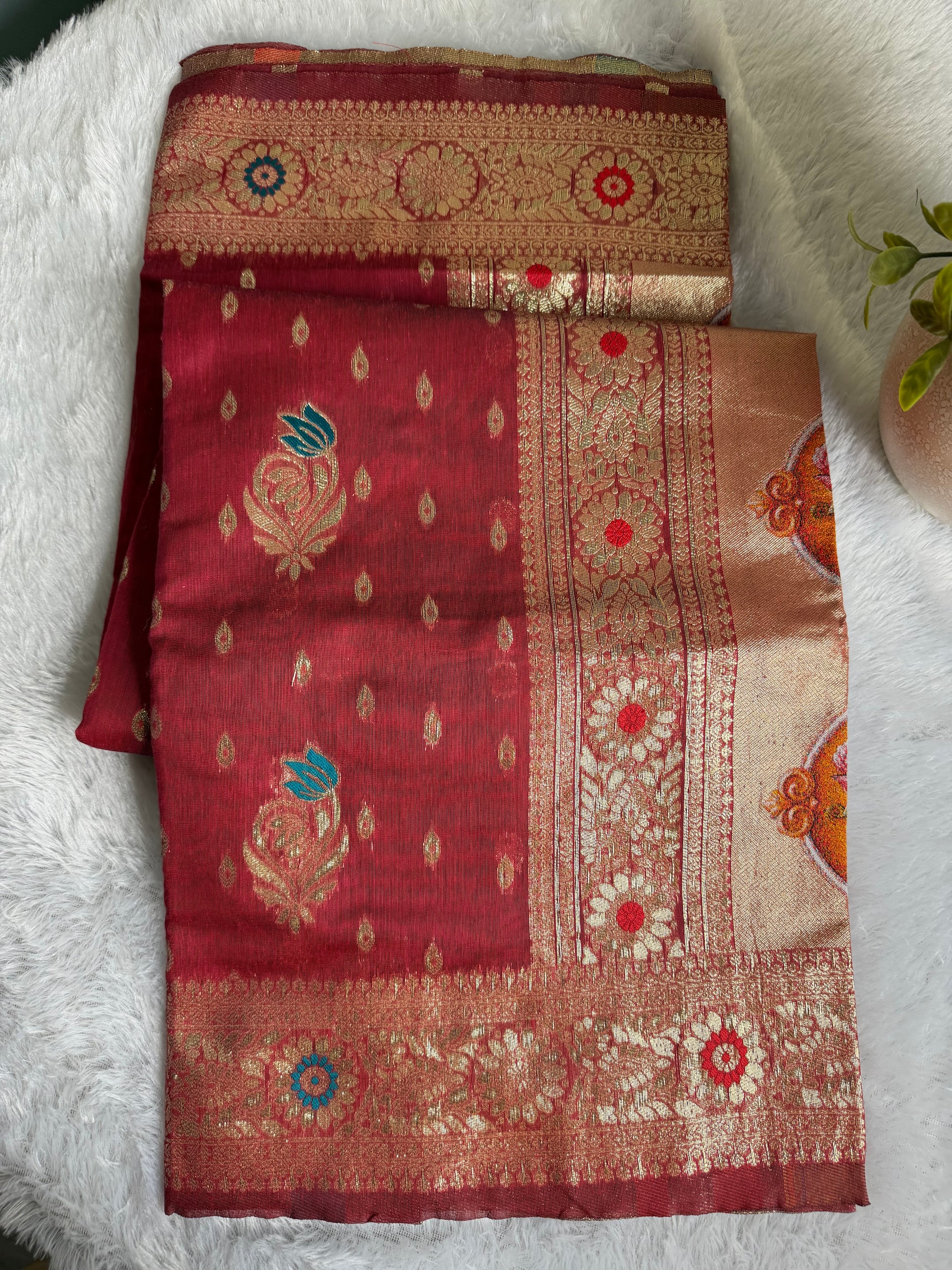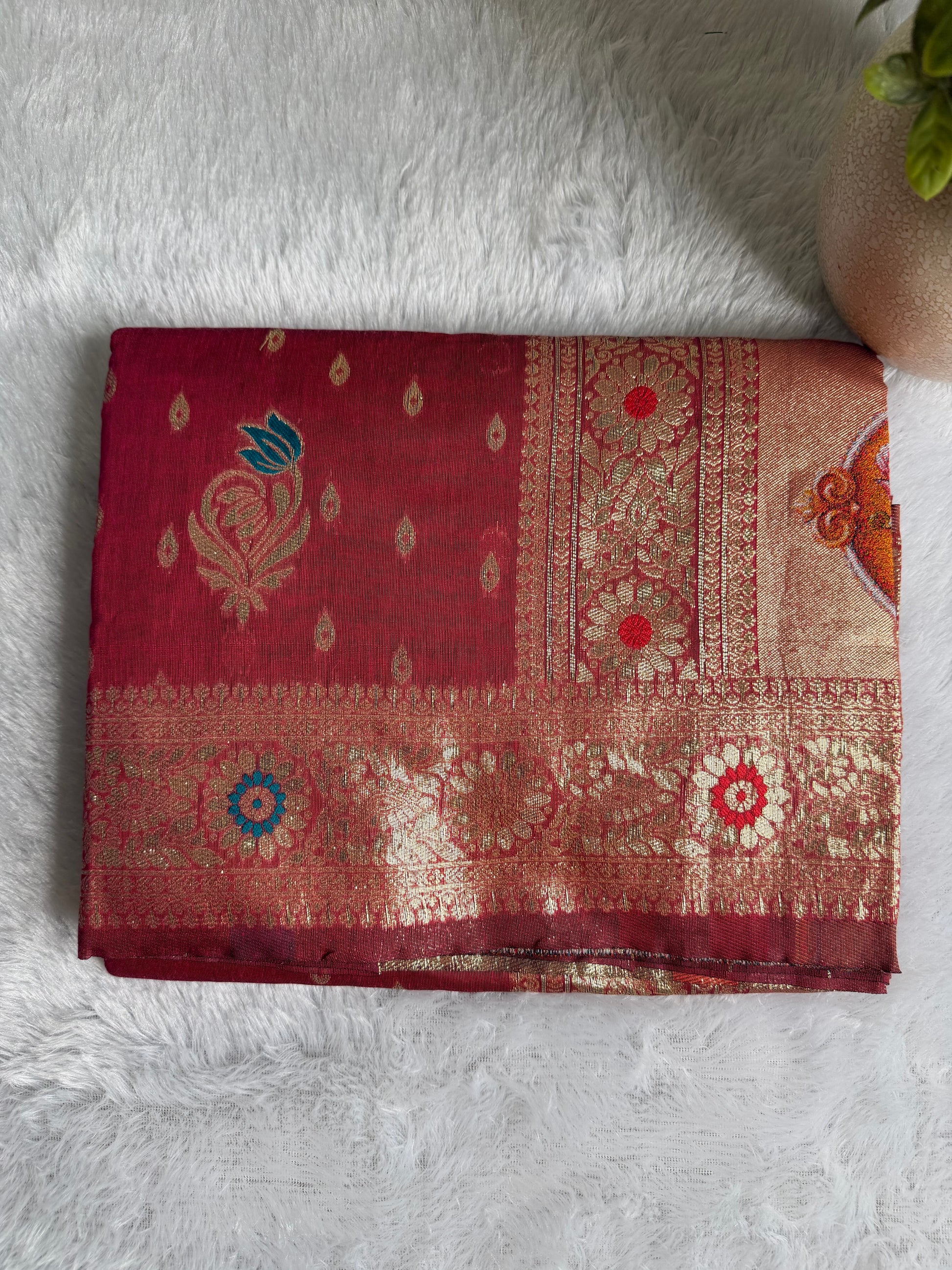 This saree is crafted in rich Texture Silk, featuring a unique textured finish that adds depth and character to the fabric. With a soft sheen and structured yet graceful drape, it offers a refined and elegant look. The subtle texture enhances its visual appeal, making it suitable for festive occasions, traditional functions, and elegant day wear.