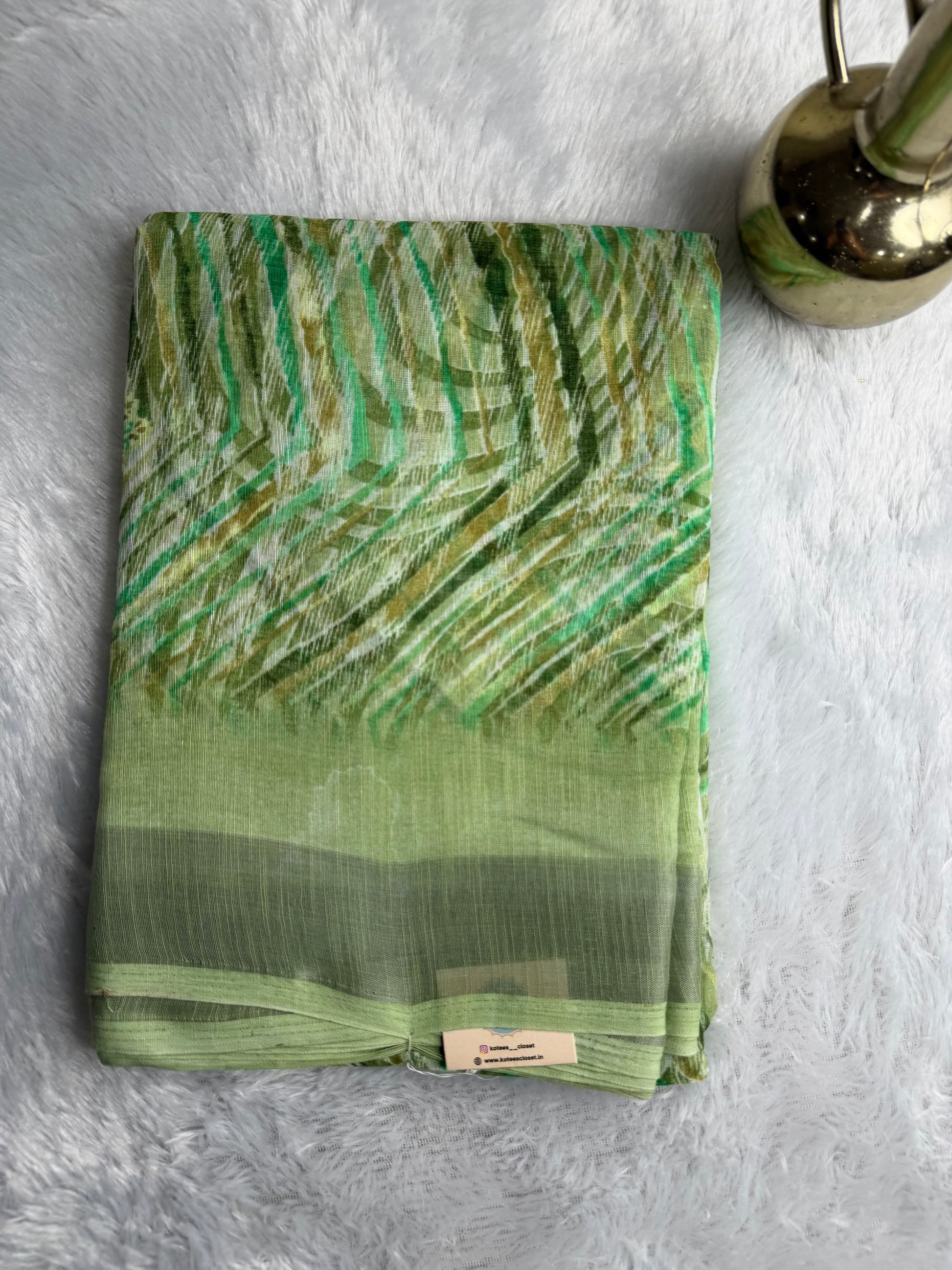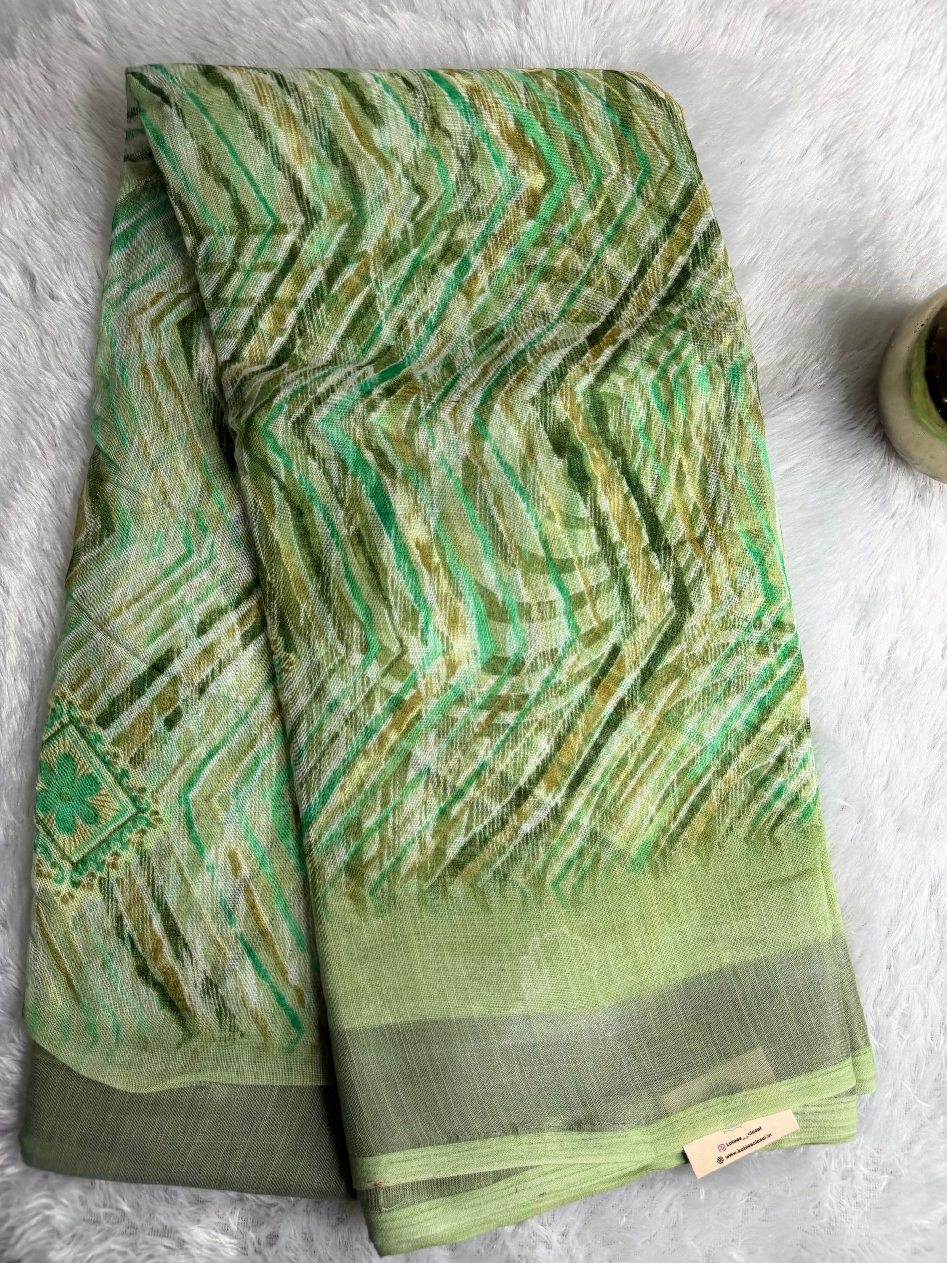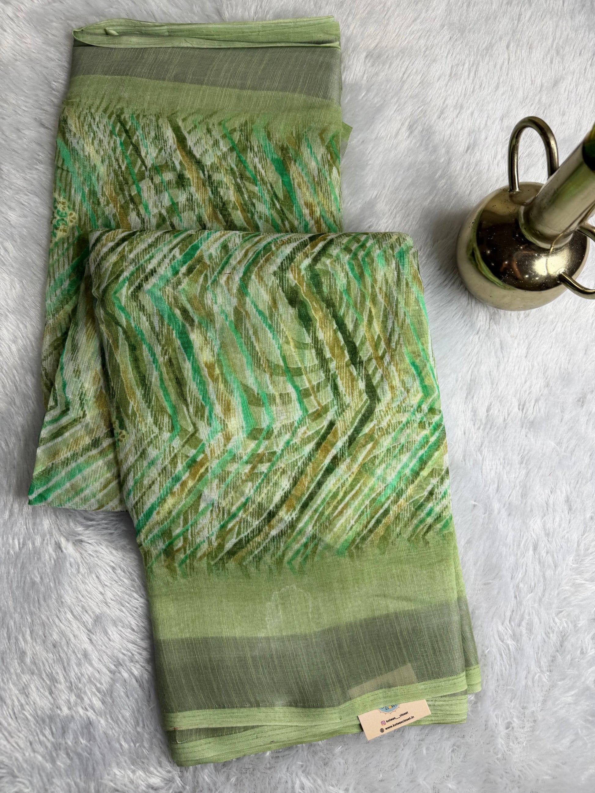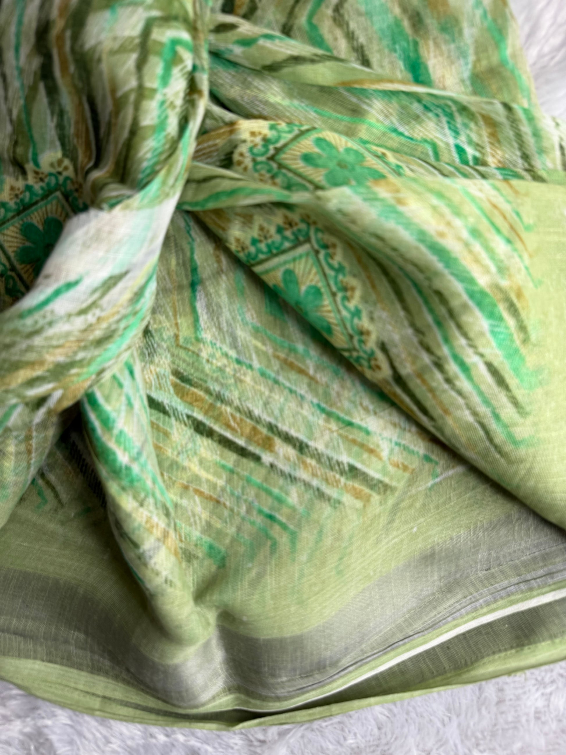 This saree is crafted in a breathable linen cotton blend, featuring soft digital floral prints with a subtle self-finish pallu and neat edge detailing. Lightweight and airy, it offers a crisp yet comfortable drape, making it ideal for daily wear, office use, and casual outings with an elegant, refreshing look.