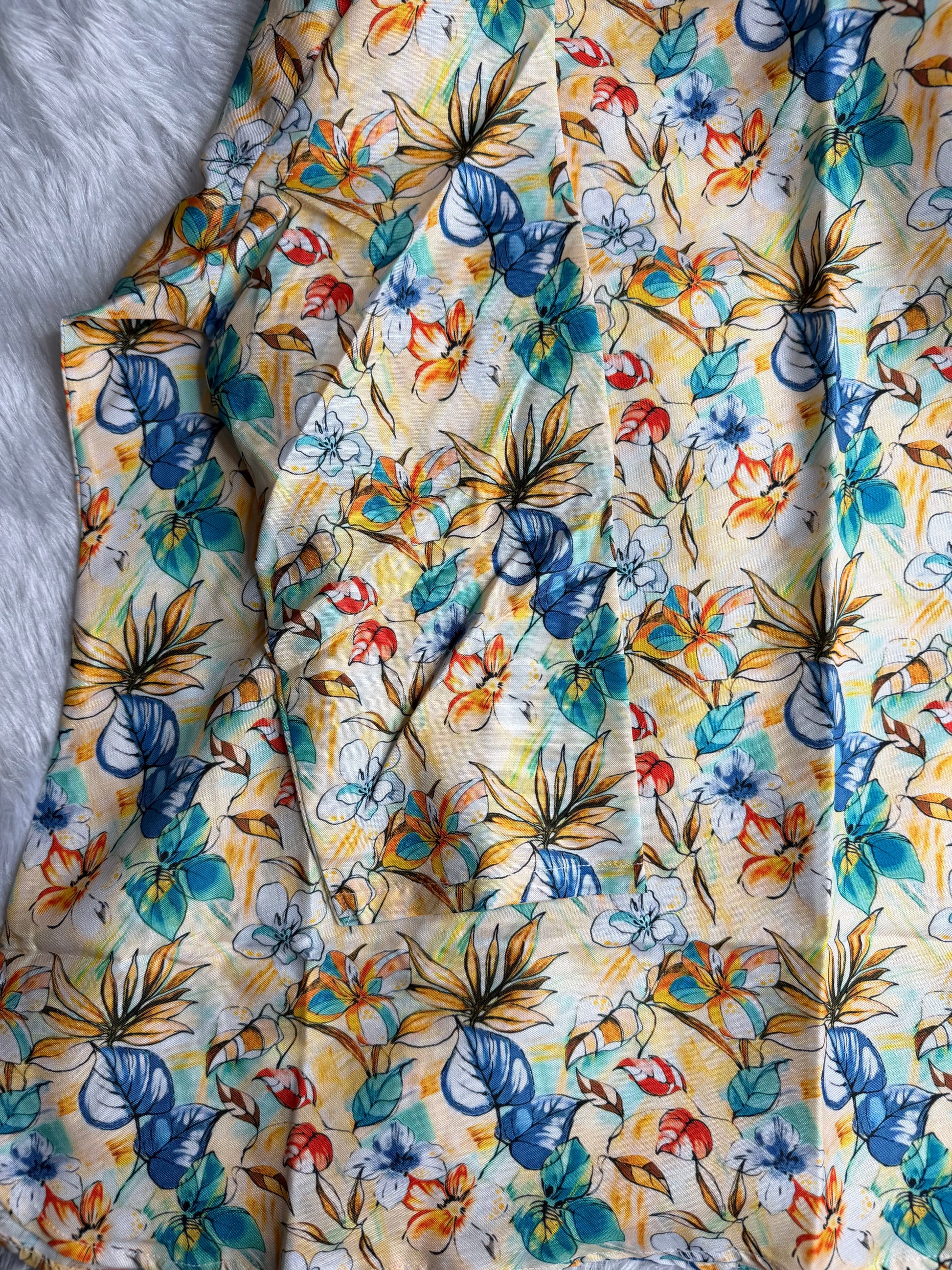 Designed in a smooth, breathable fabric, this short western top showcases a lively floral print that adds a cheerful and refreshing touch to your everyday wardrobe. The soft texture ensures a comfortable feel, while the lightweight construction allows easy movement throughout the day. Featuring a relaxed fit with a neatly finished V-neckline, it offers a balanced blend of style and comfort. Ideal for casual wear, workdays, or relaxed outings, this top pairs effortlessly with jeans, trousers, or skirts for a versatile look.