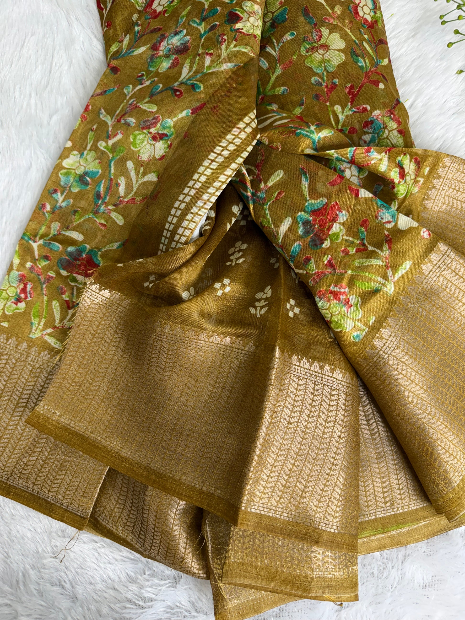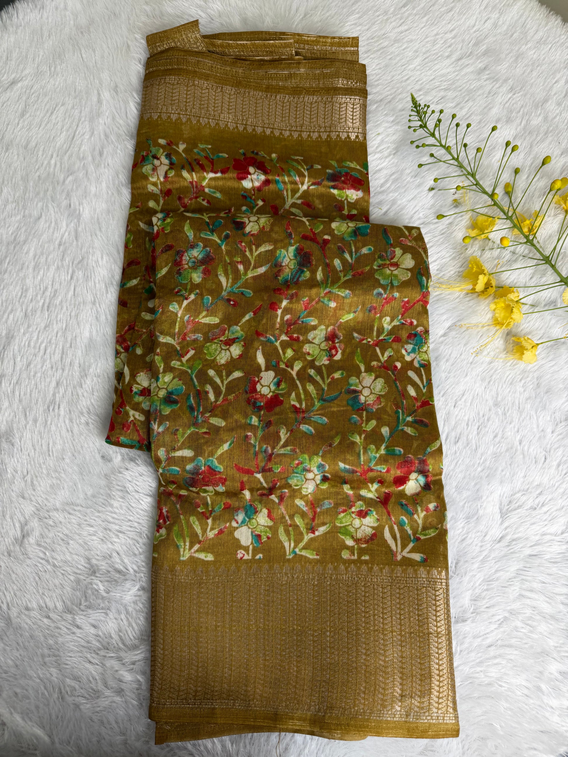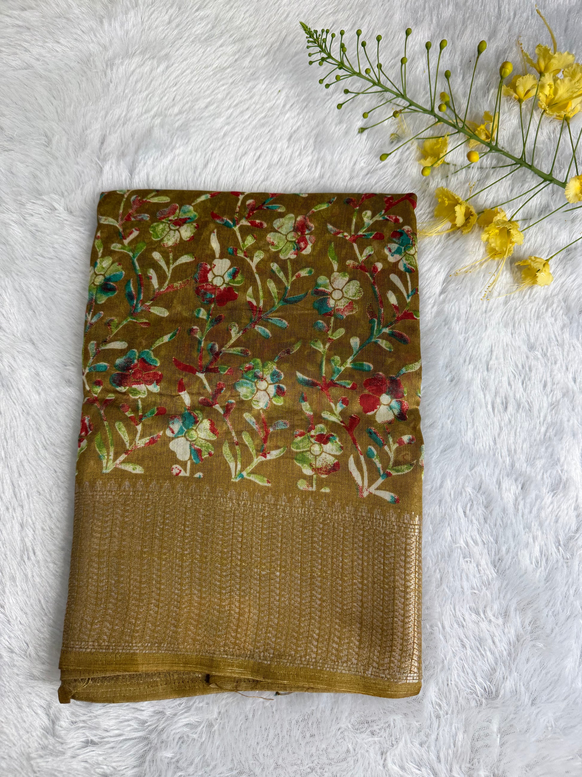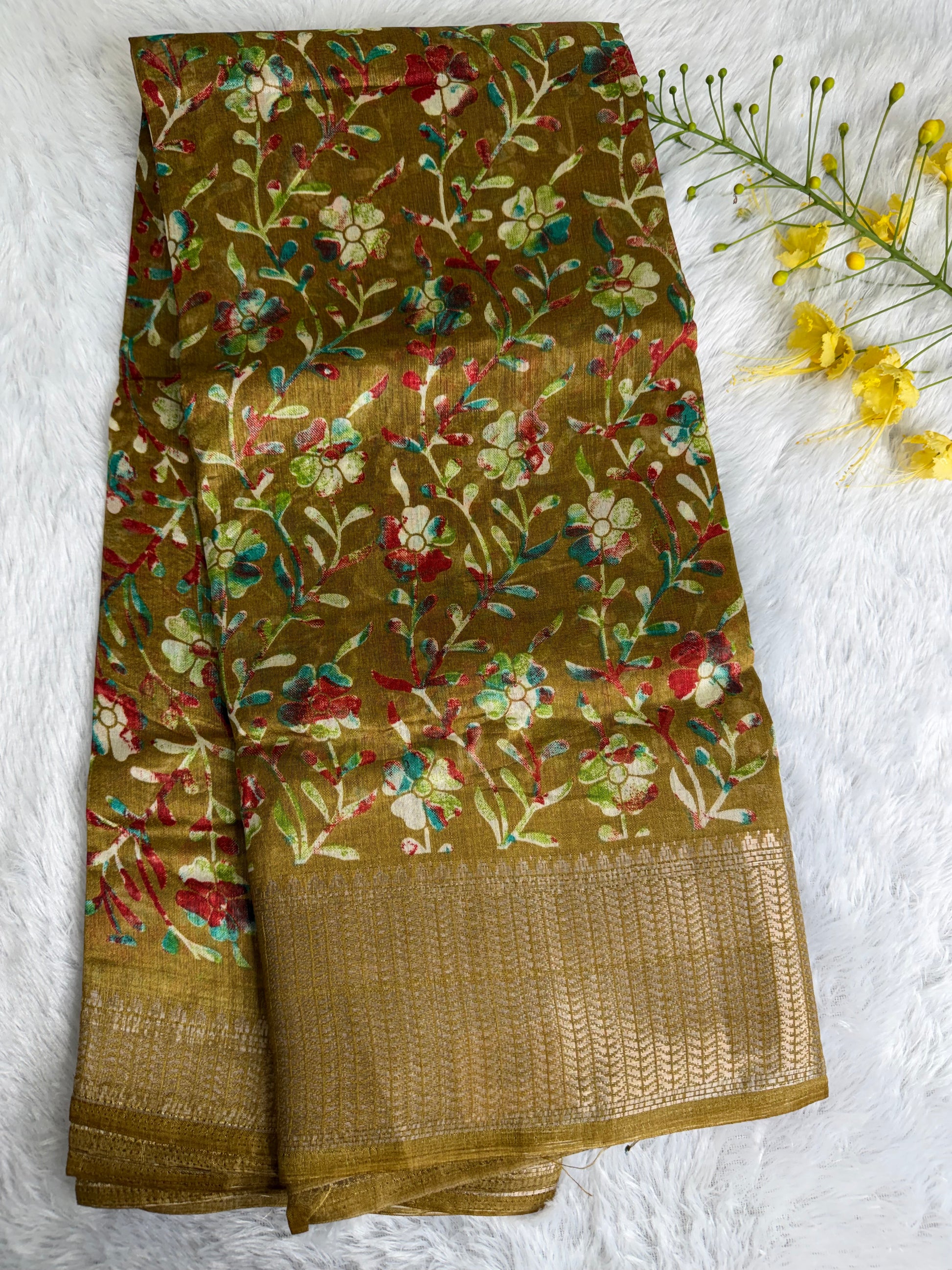 This saree is crafted in soft and lustrous Dola Silk, featuring elegant floral prints across the body and a beautifully detailed woven border. The smooth texture and graceful drape give it a rich yet comfortable feel, making it suitable for daily wear, festive occasions, and casual functions.