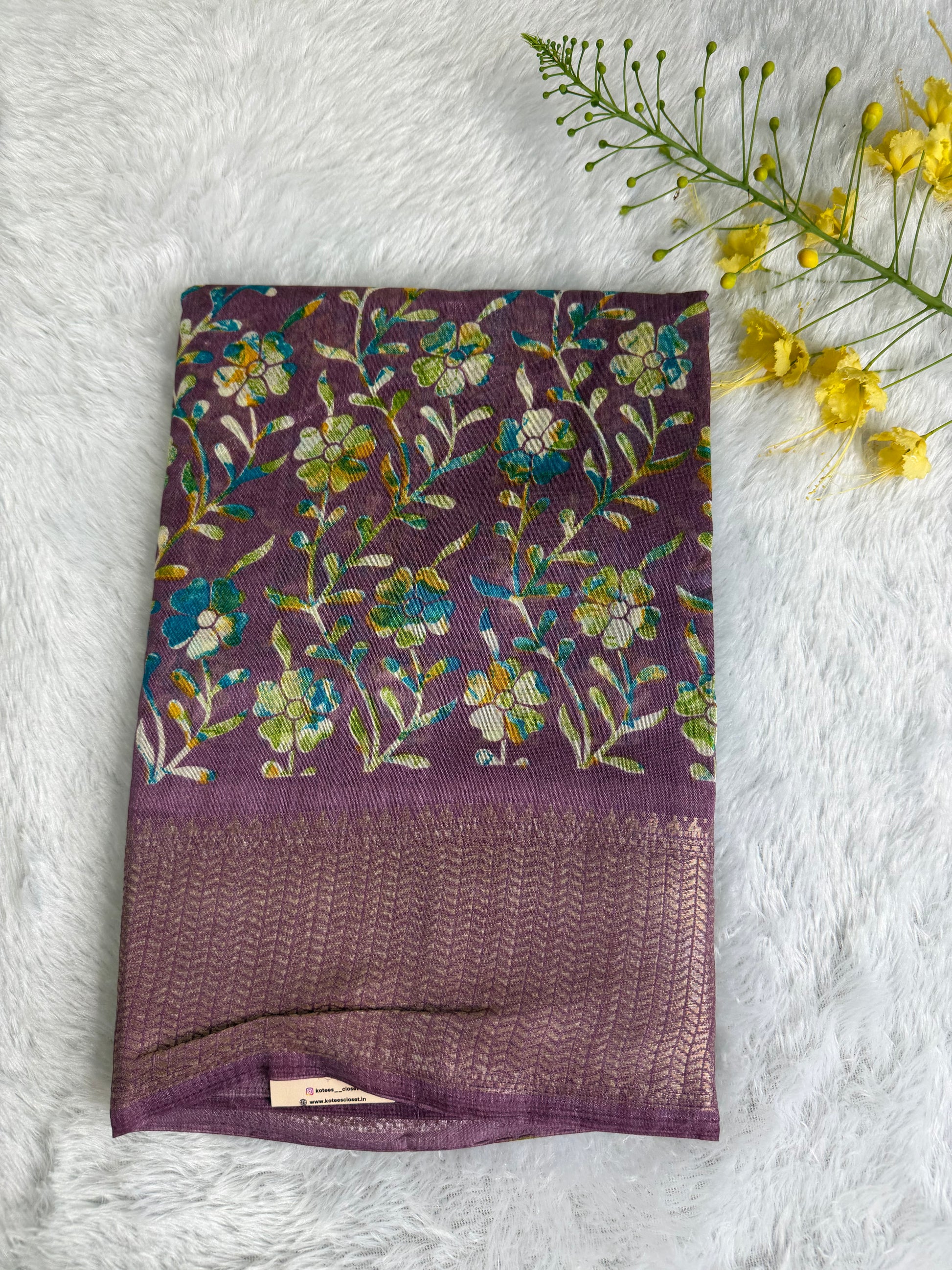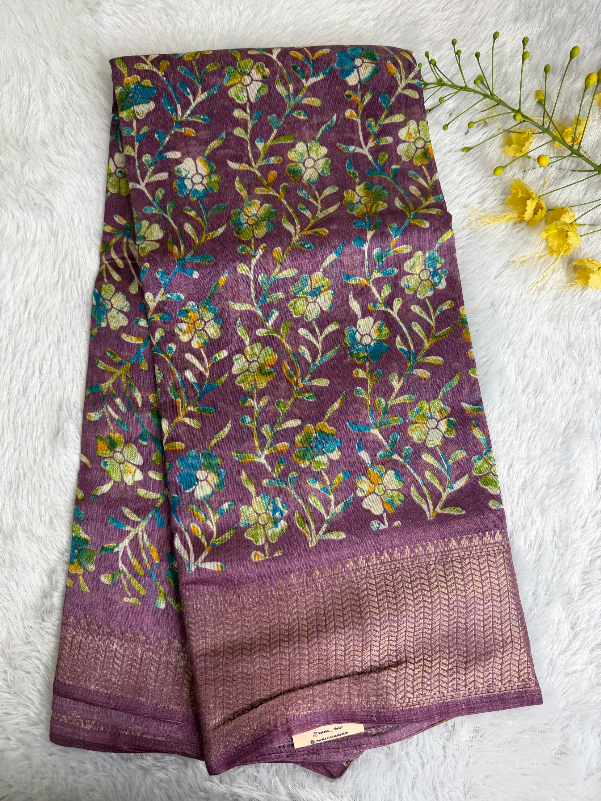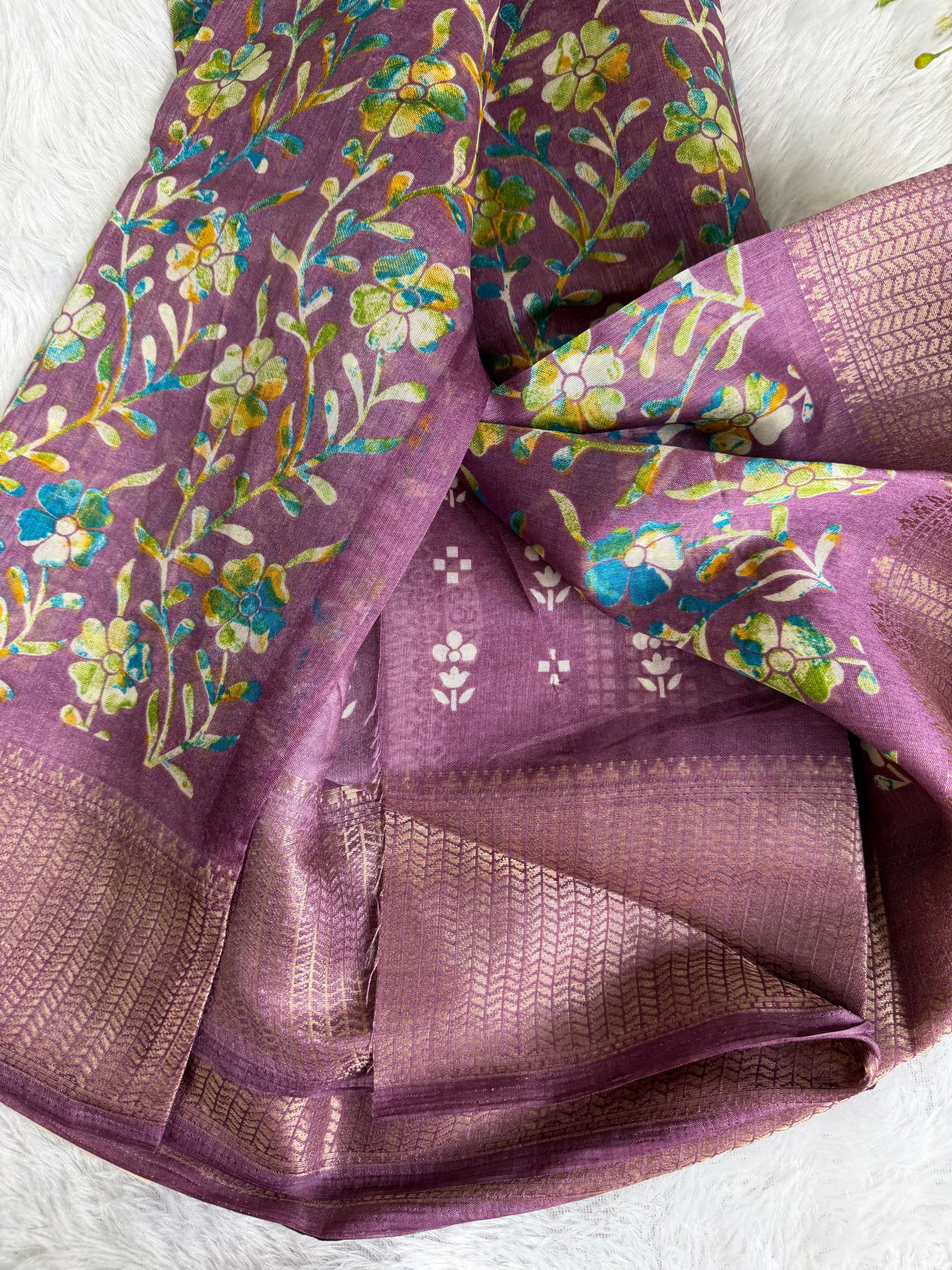 This saree is crafted in soft and lustrous Dola Silk, featuring elegant floral prints across the body and a beautifully detailed woven border. The smooth texture and graceful drape give it a rich yet comfortable feel, making it suitable for daily wear, festive occasions, and casual functions.