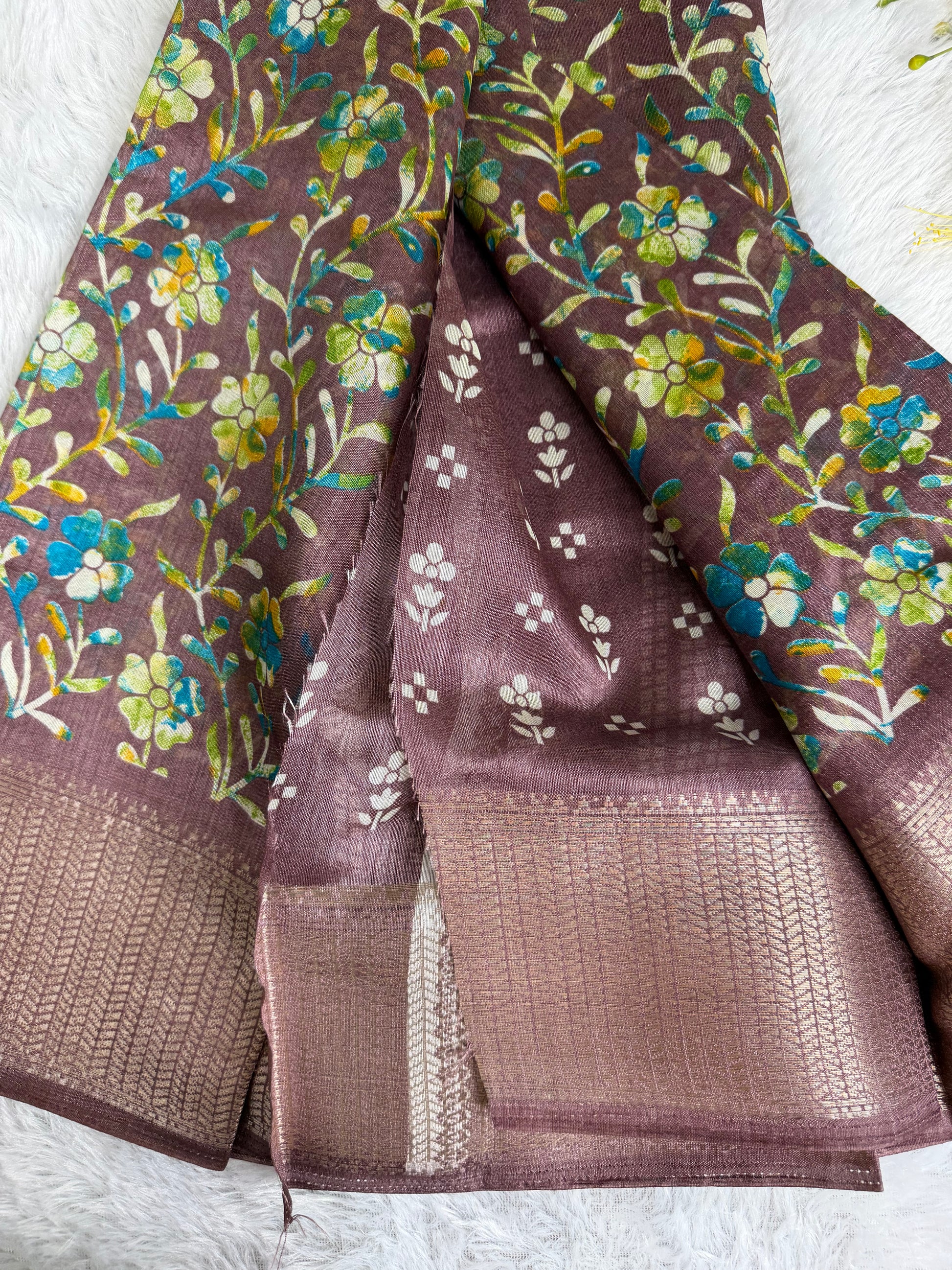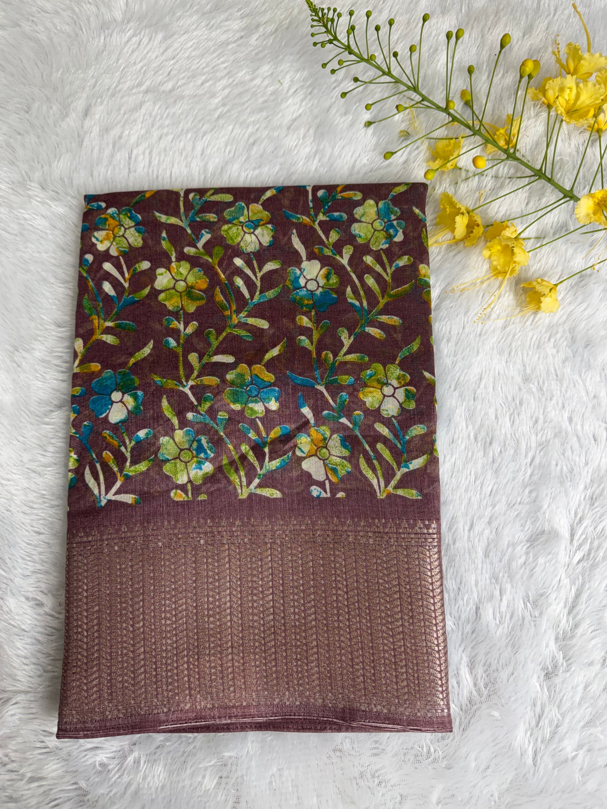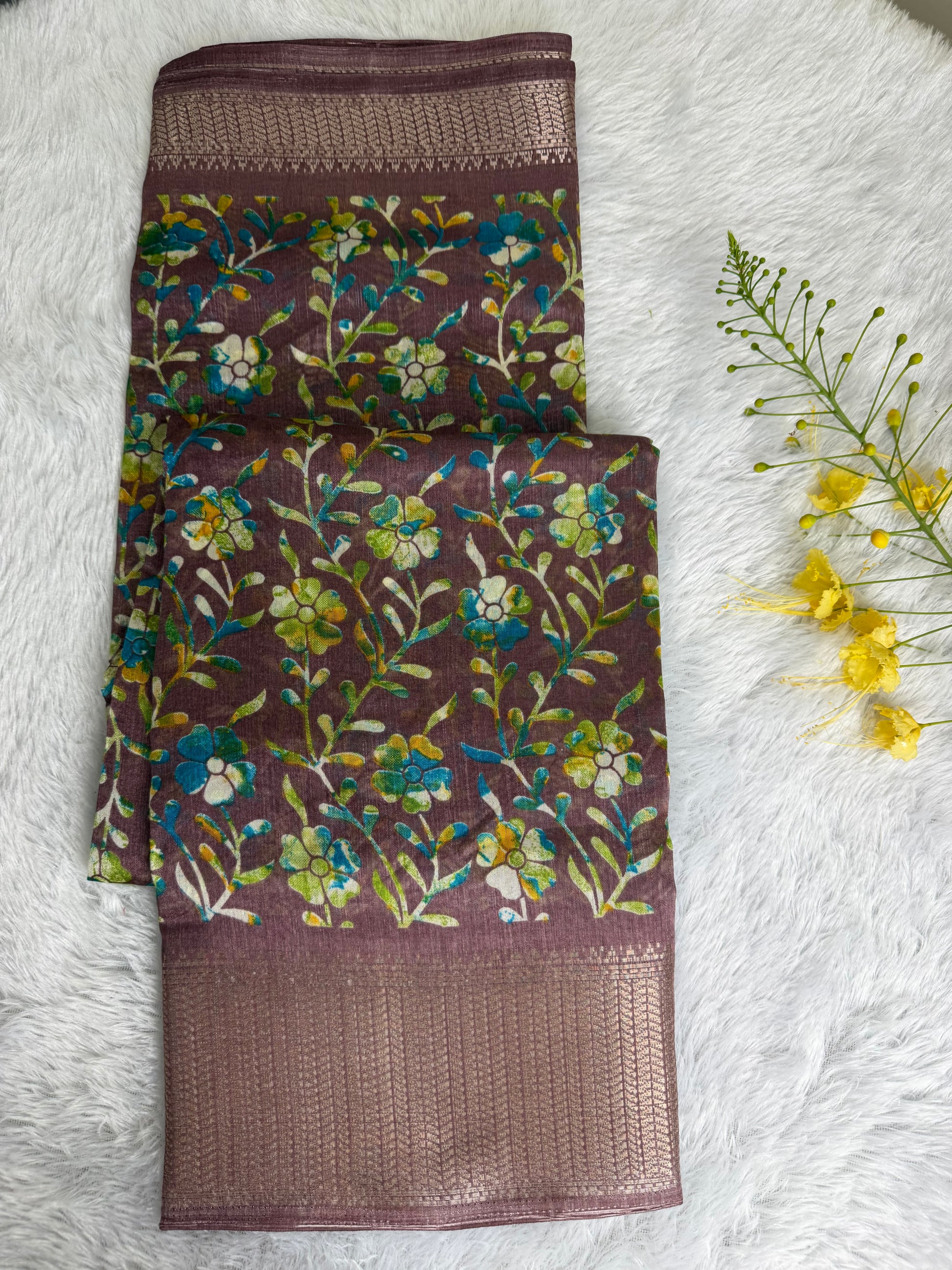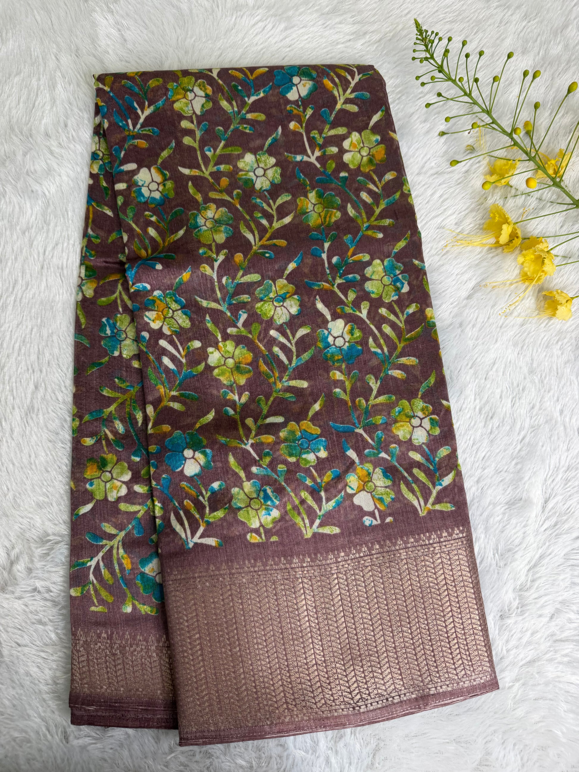 This saree is crafted in soft and lustrous Dola Silk, featuring elegant floral prints across the body and a beautifully detailed woven border. The smooth texture and graceful drape give it a rich yet comfortable feel, making it suitable for daily wear, festive occasions, and casual functions.