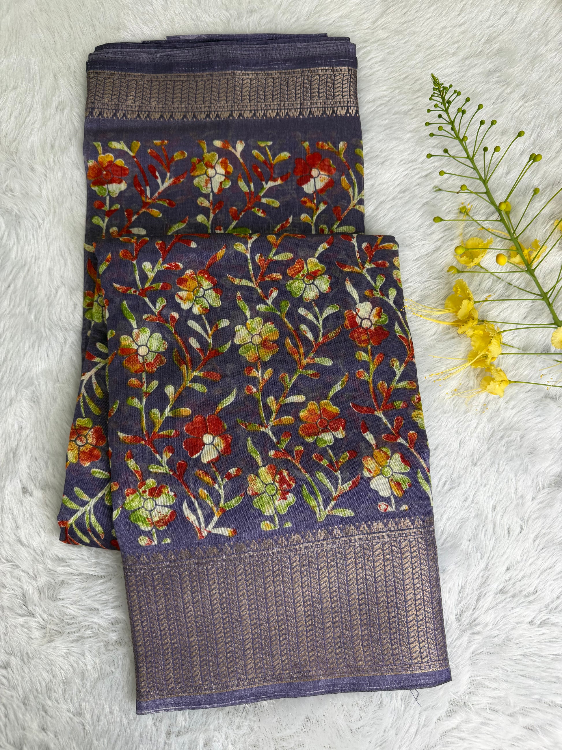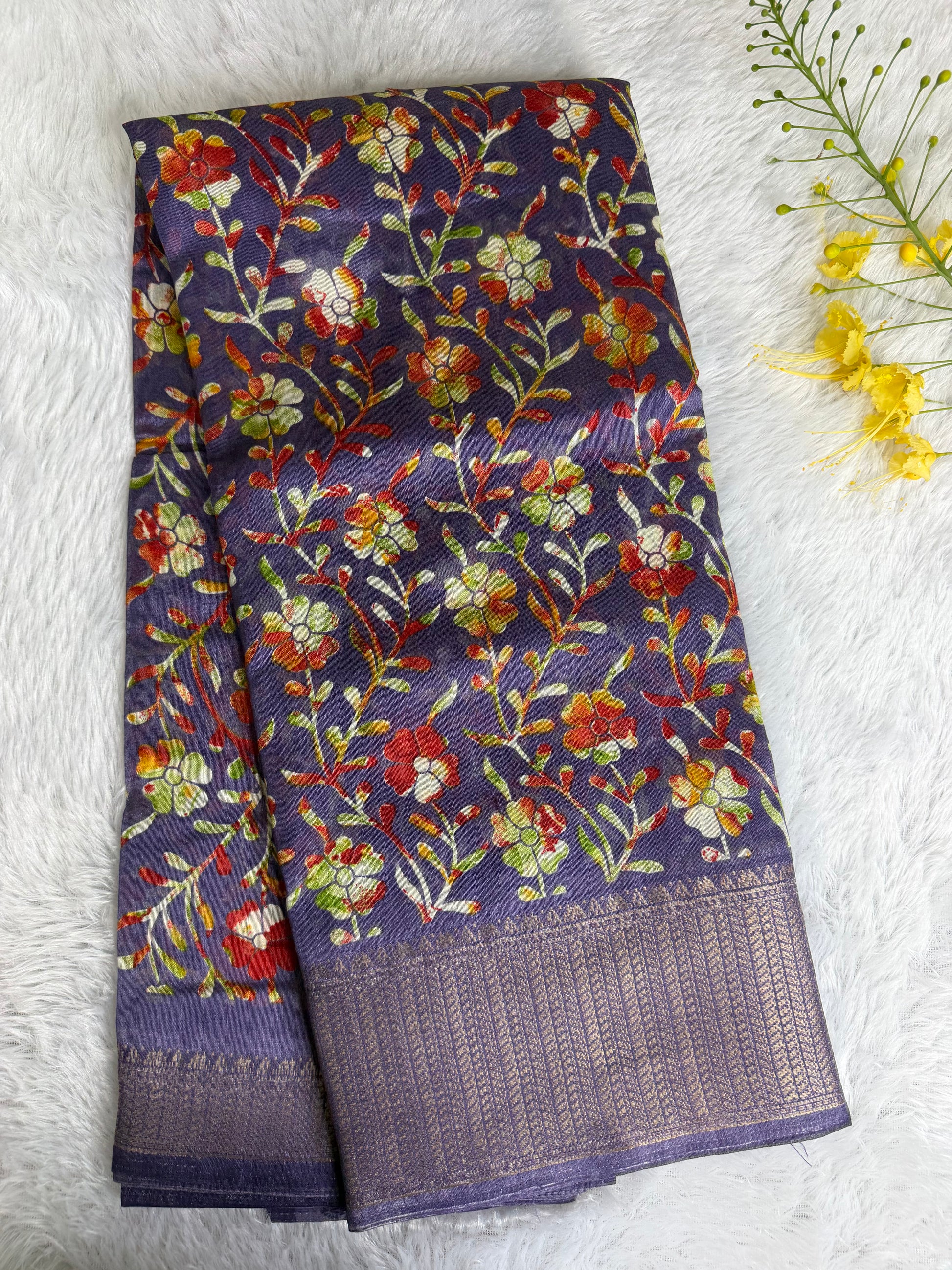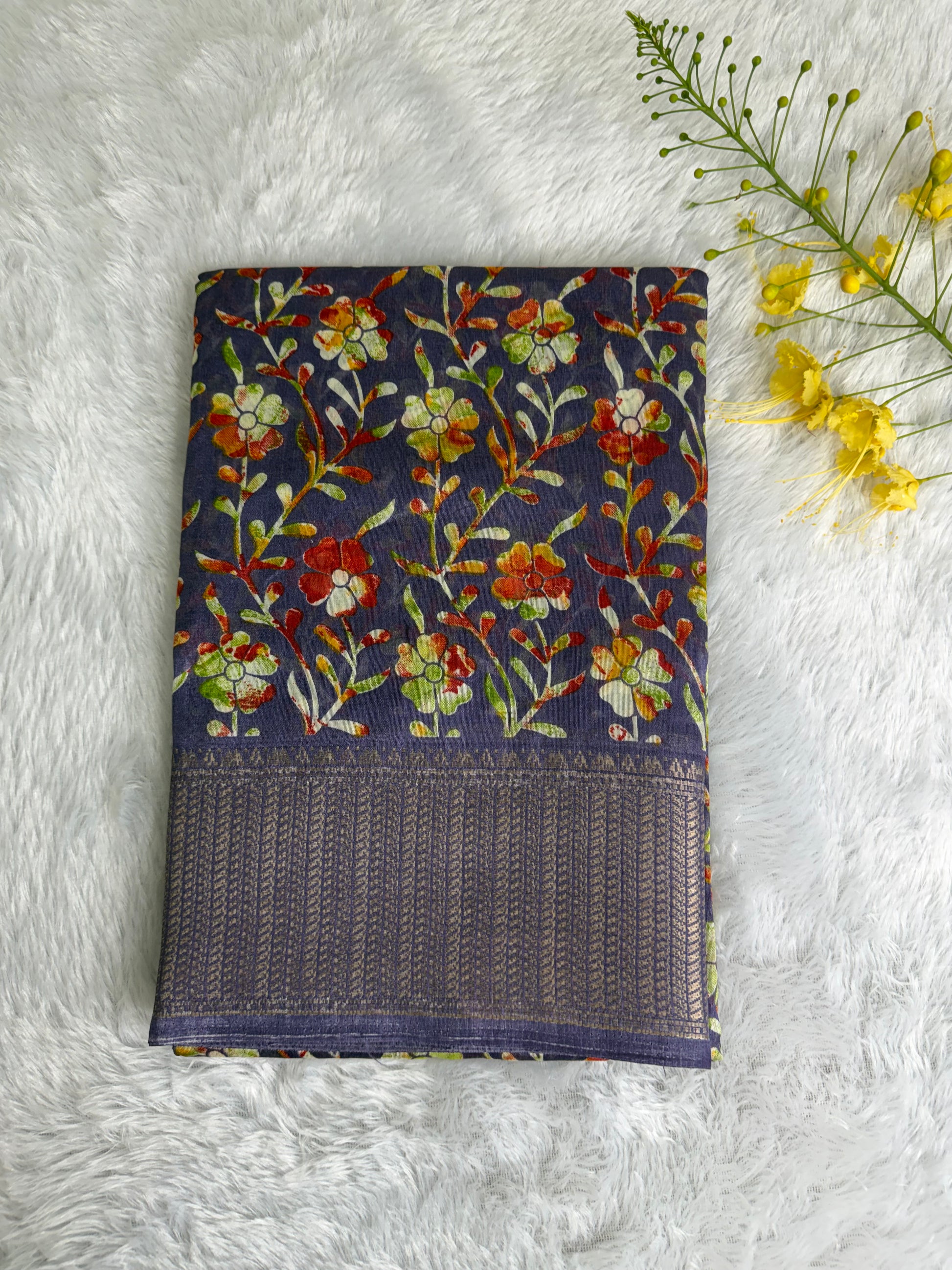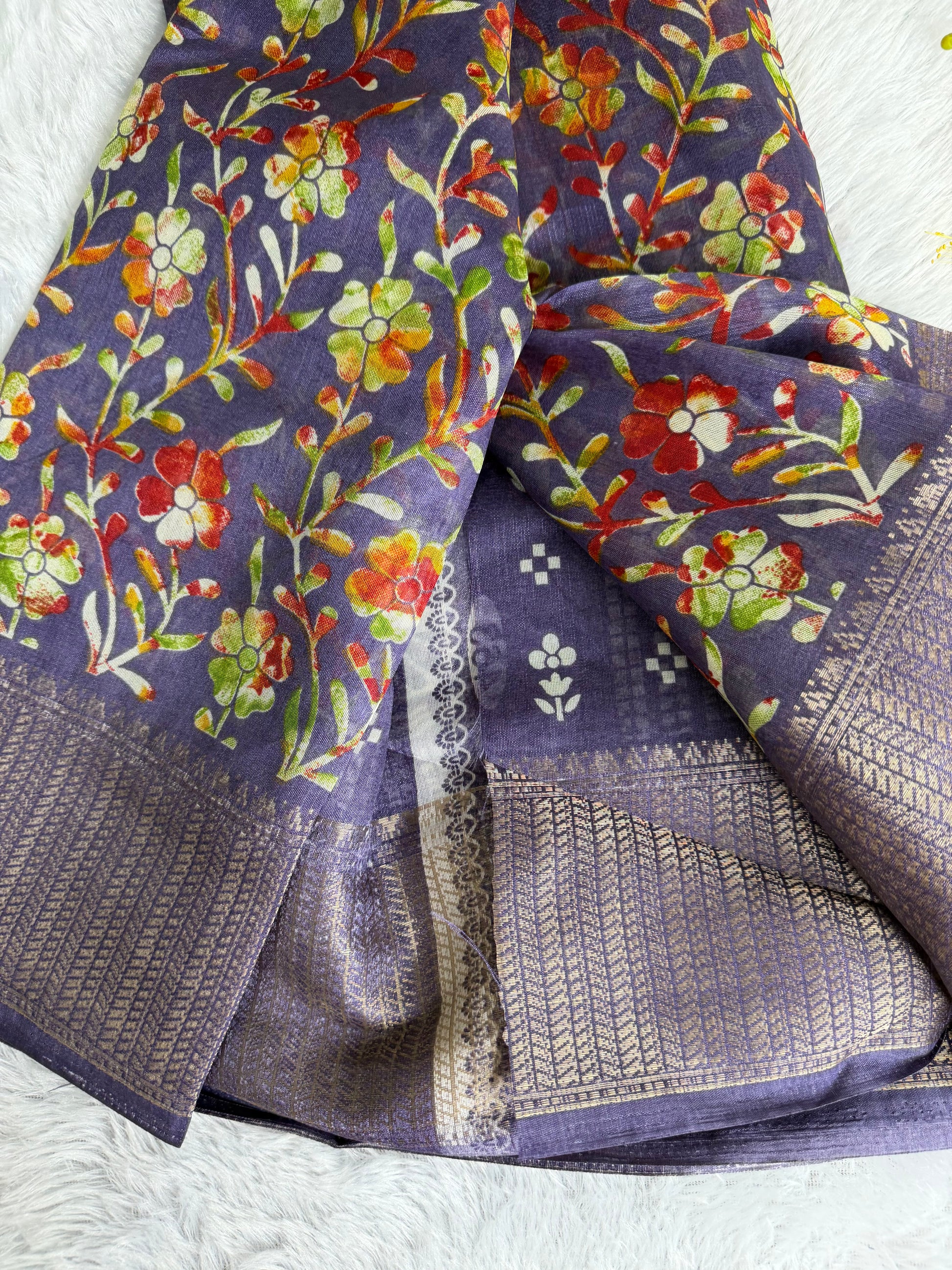 This saree is crafted in soft and lustrous Dola Silk, featuring elegant floral prints across the body and a beautifully detailed woven border. The smooth texture and graceful drape give it a rich yet comfortable feel, making it suitable for daily wear, festive occasions, and casual functions.