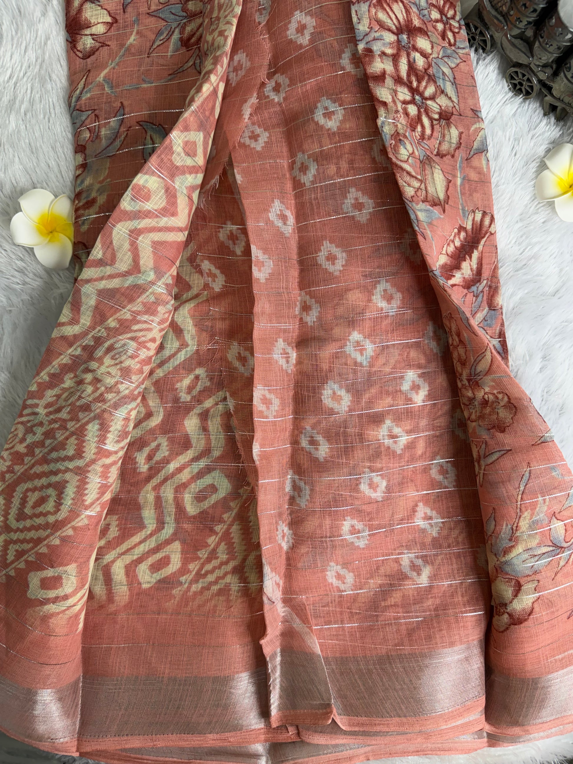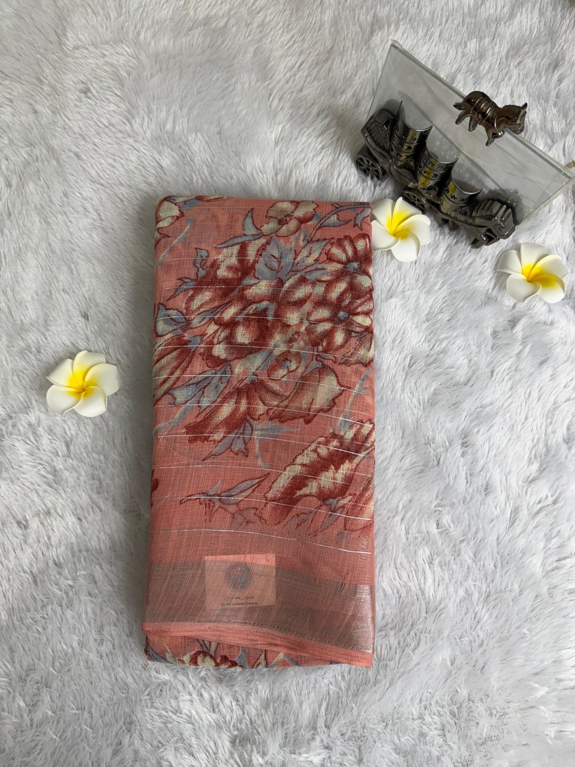 Made from fine-quality Dola Silk, this saree showcases elegant prints complemented by a subtly woven border. The fabric drapes beautifully with a soft sheen, offering a refined look suitable for small functions, casual festivities, and graceful day wear.
