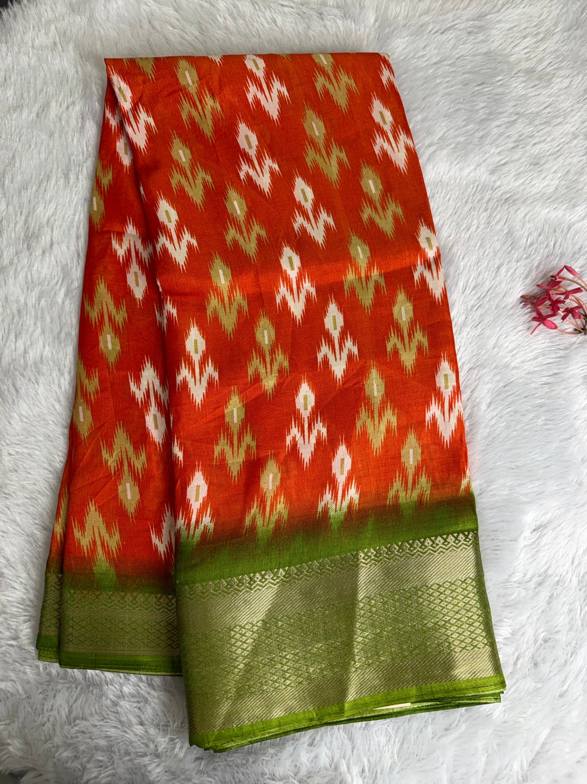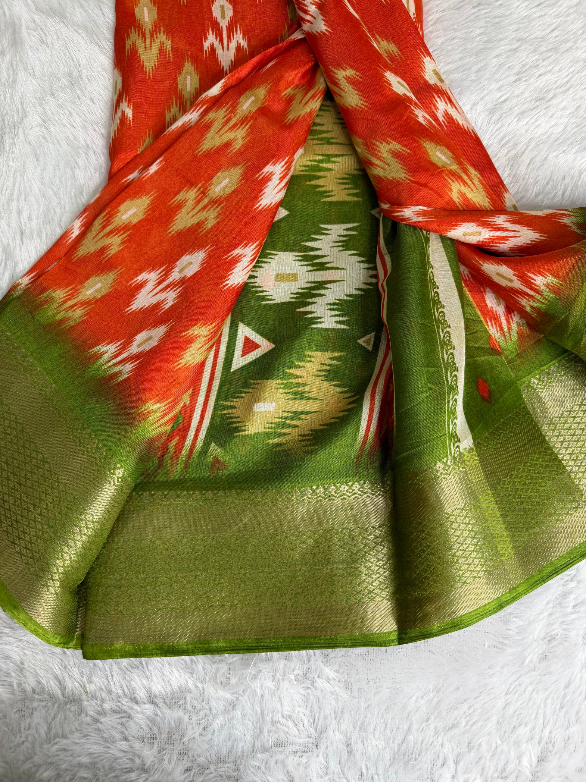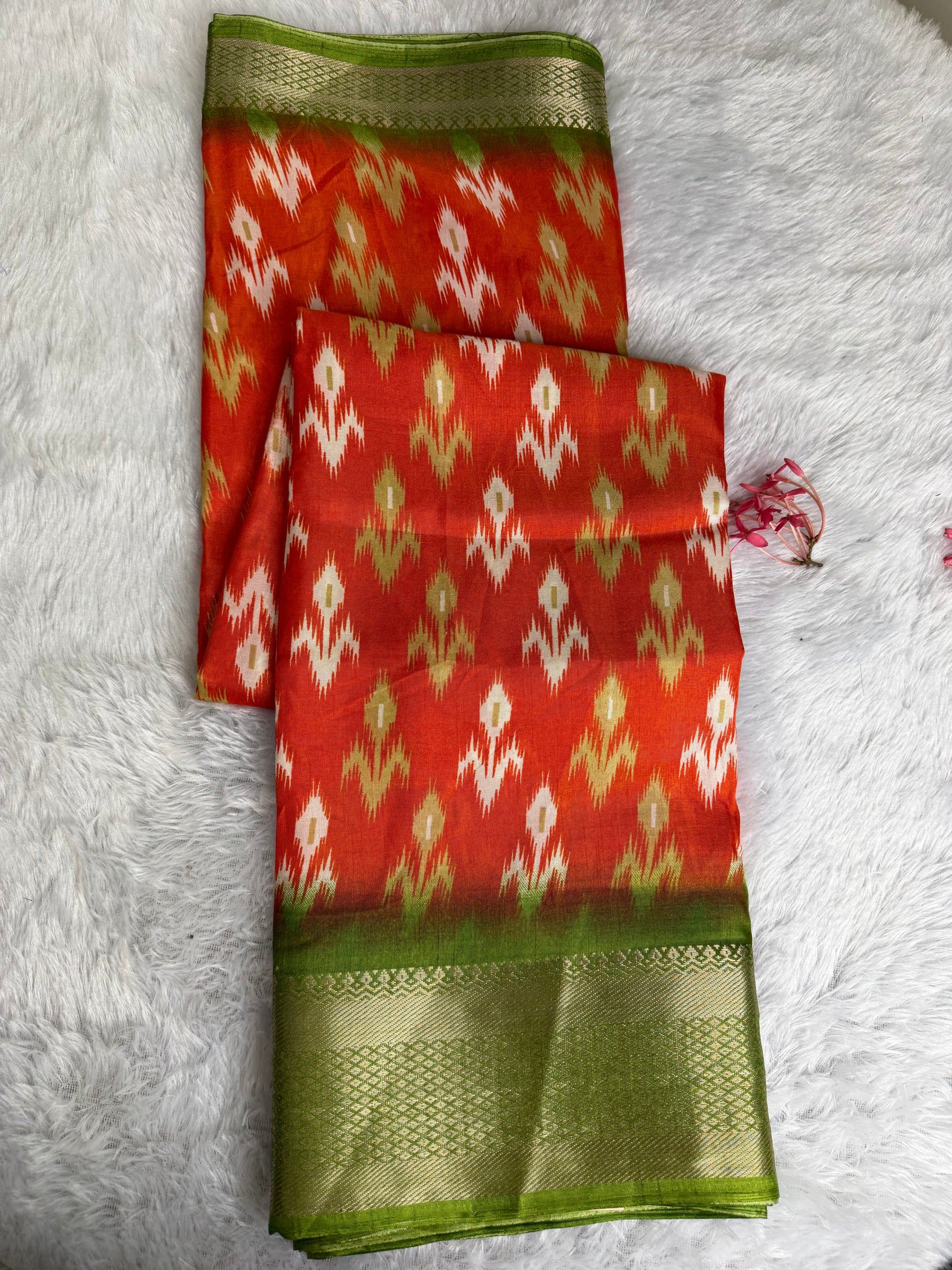 This saree is designed in rich Dola Silk with detailed floral prints and an enhanced woven border that adds depth and charm. With its smooth texture and elegant fall, it is perfect for festive gatherings, traditional functions, and special occasions.