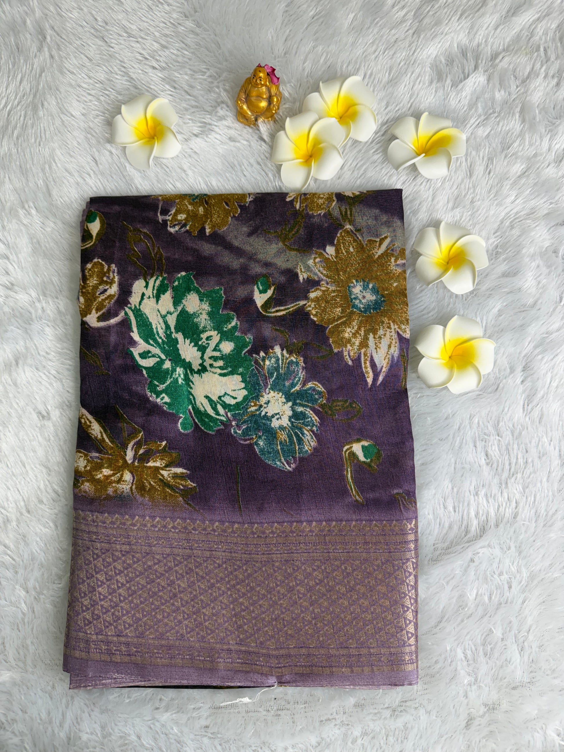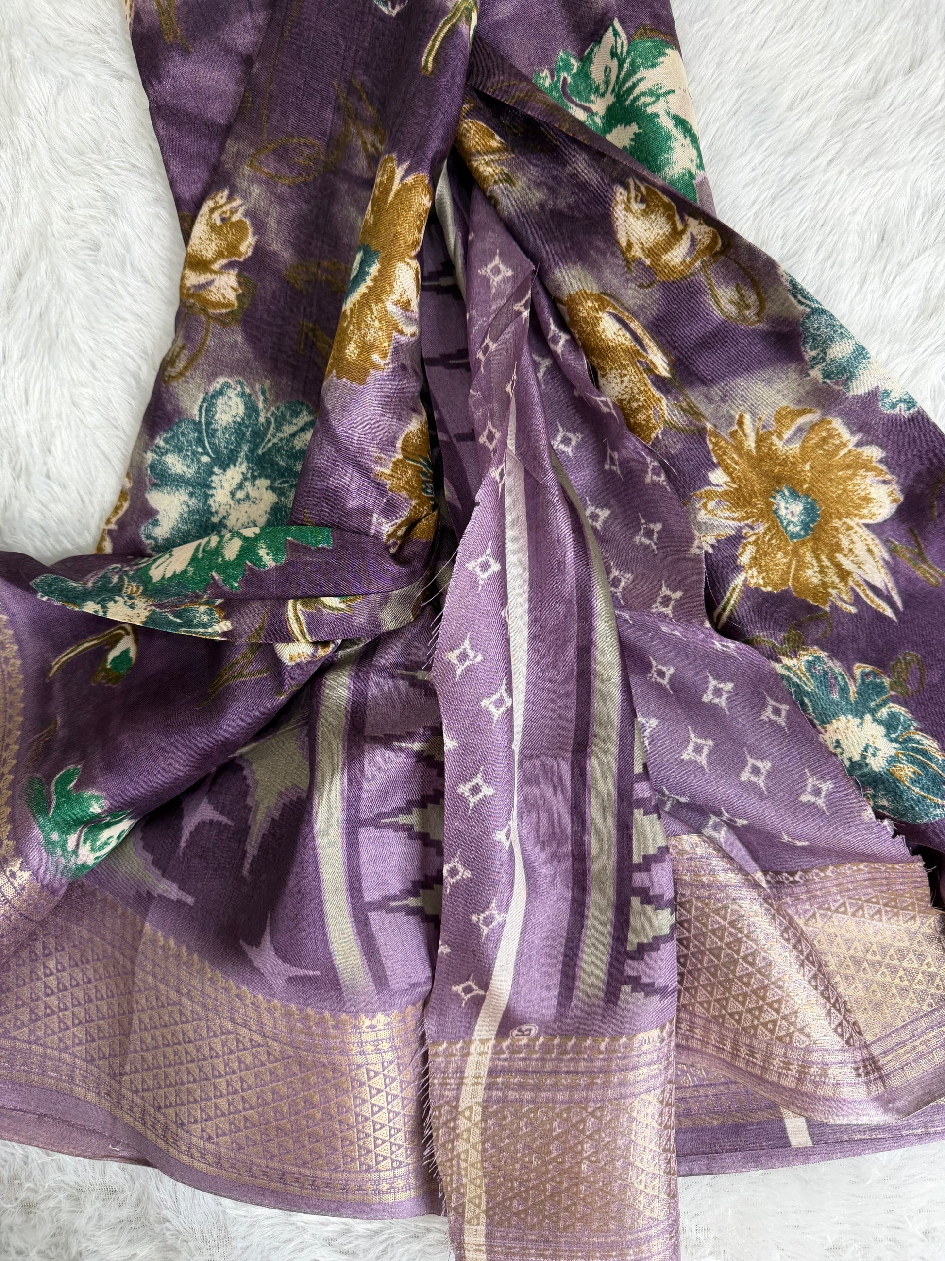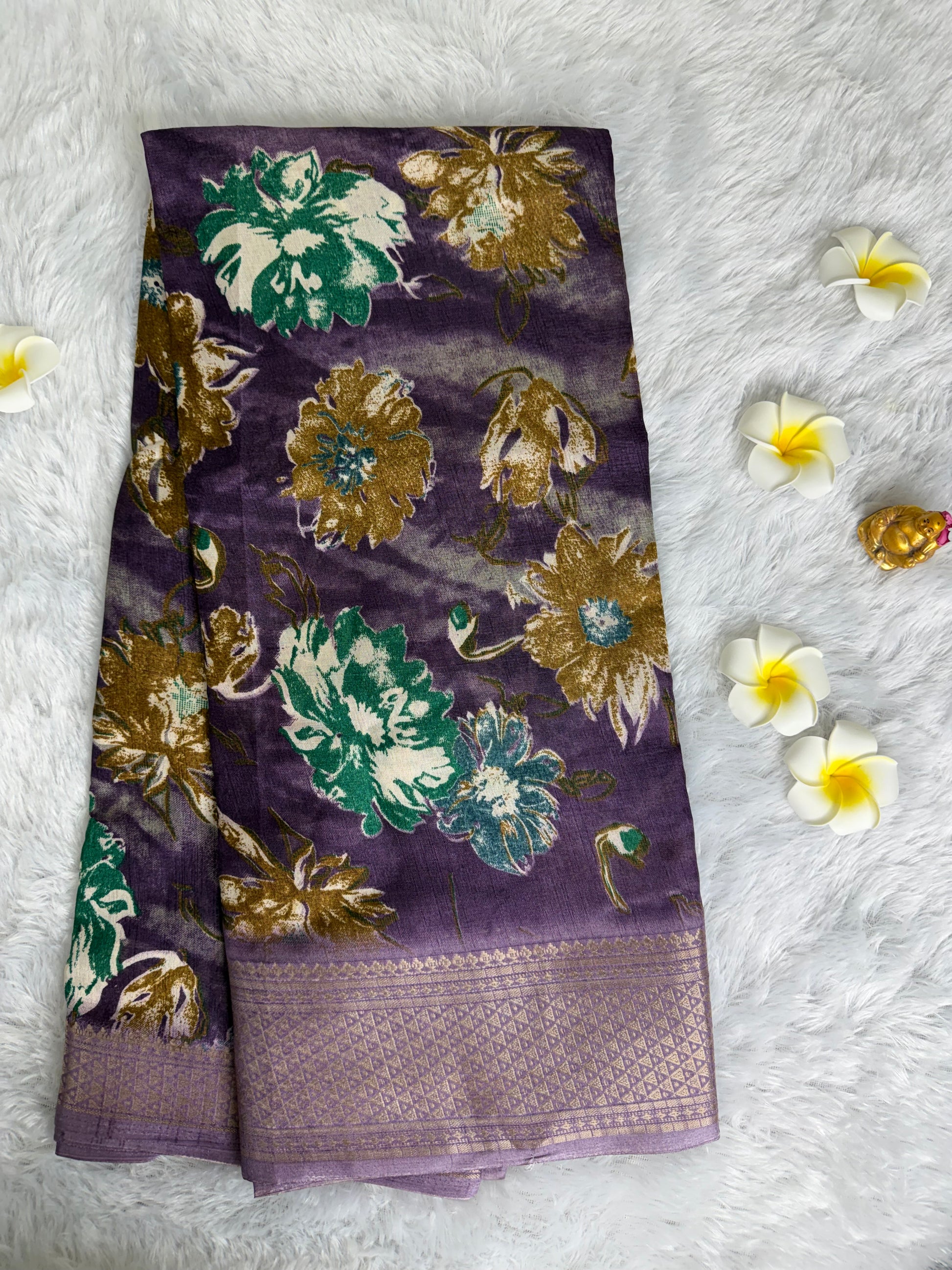 This saree is designed in rich Dola Silk with detailed floral prints and an enhanced woven border that adds depth and charm. With its smooth texture and elegant fall, it is perfect for festive gatherings, traditional functions, and special occasions.
