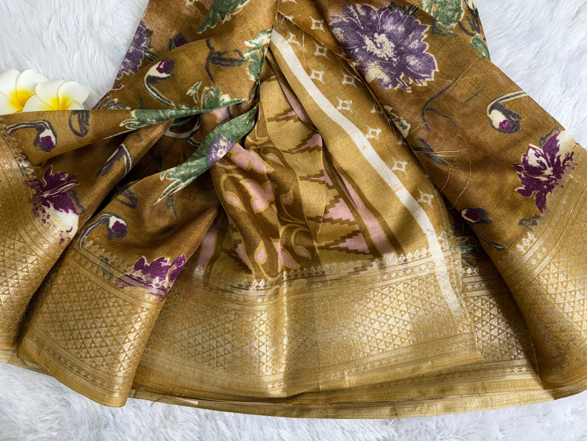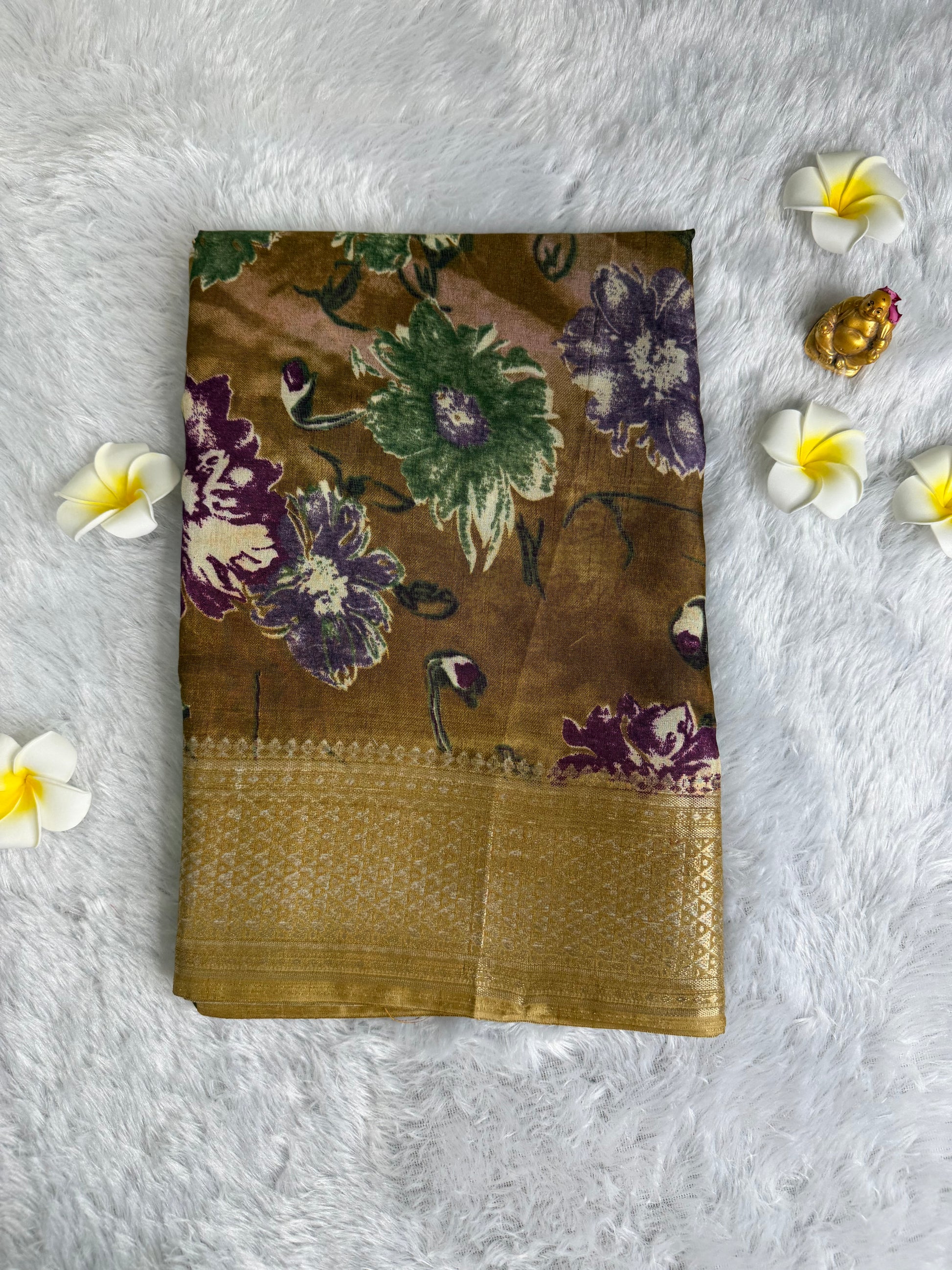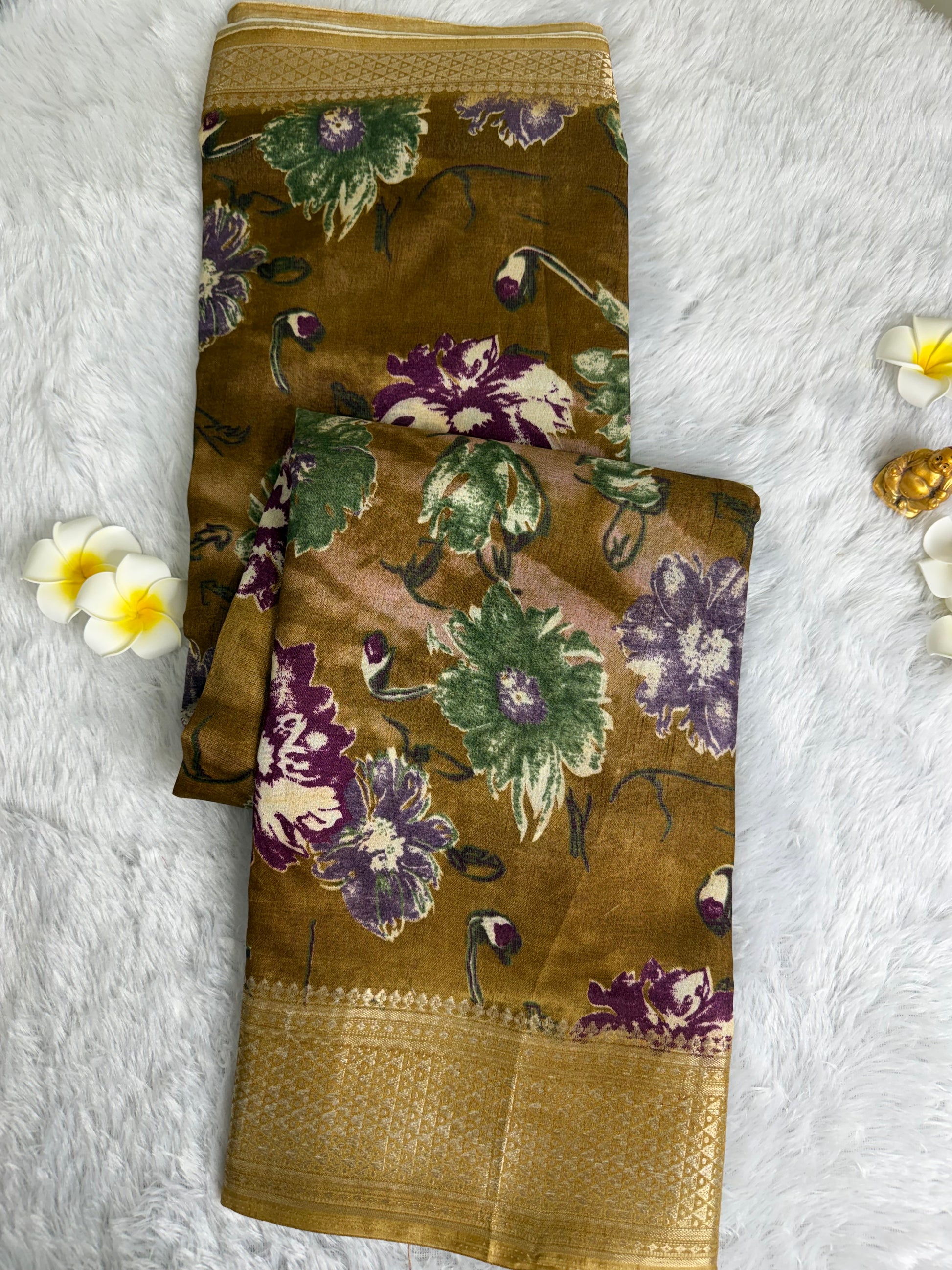 This saree is designed in rich Dola Silk with detailed floral prints and an enhanced woven border that adds depth and charm. With its smooth texture and elegant fall, it is perfect for festive gatherings, traditional functions, and special occasions.