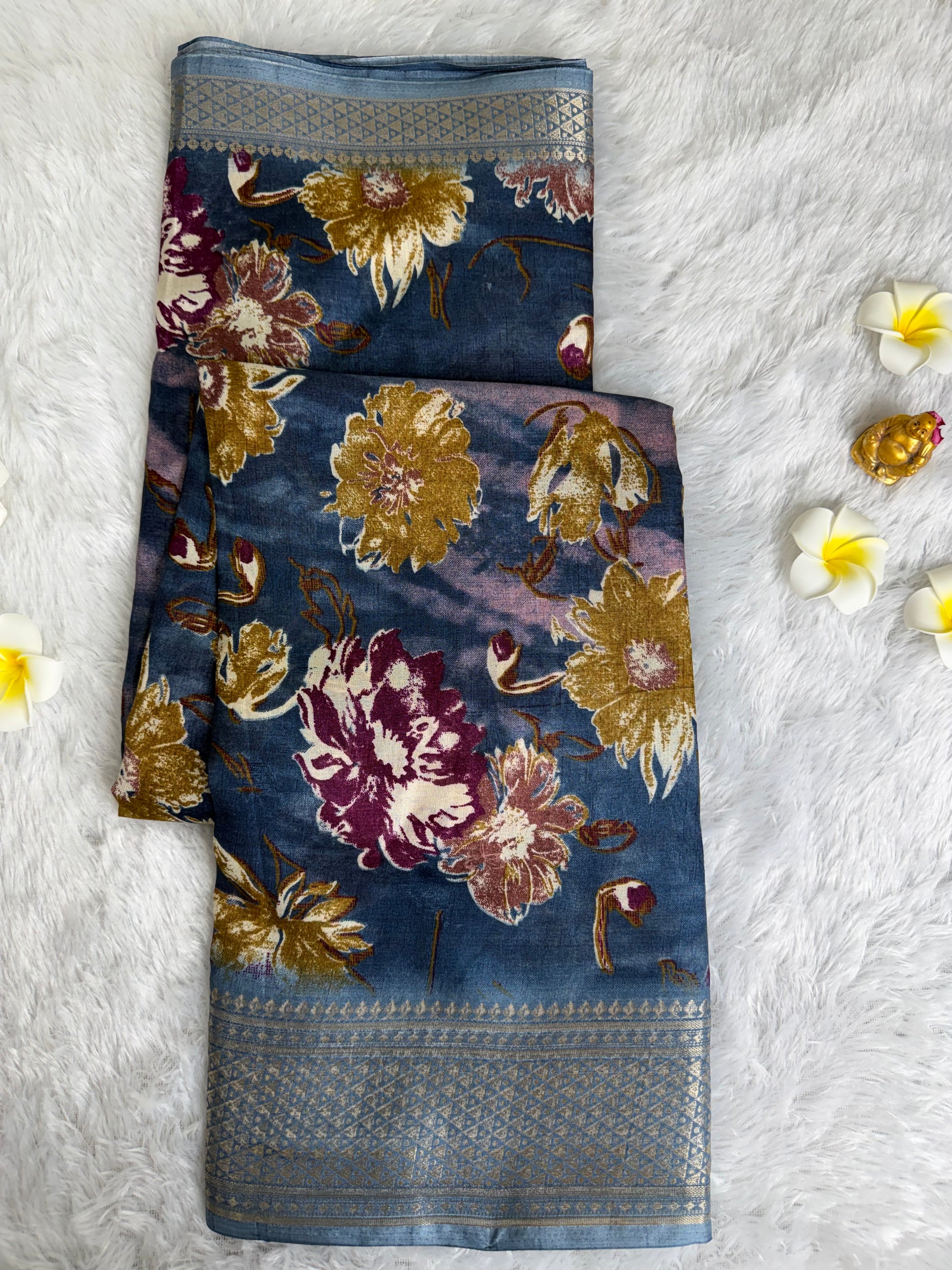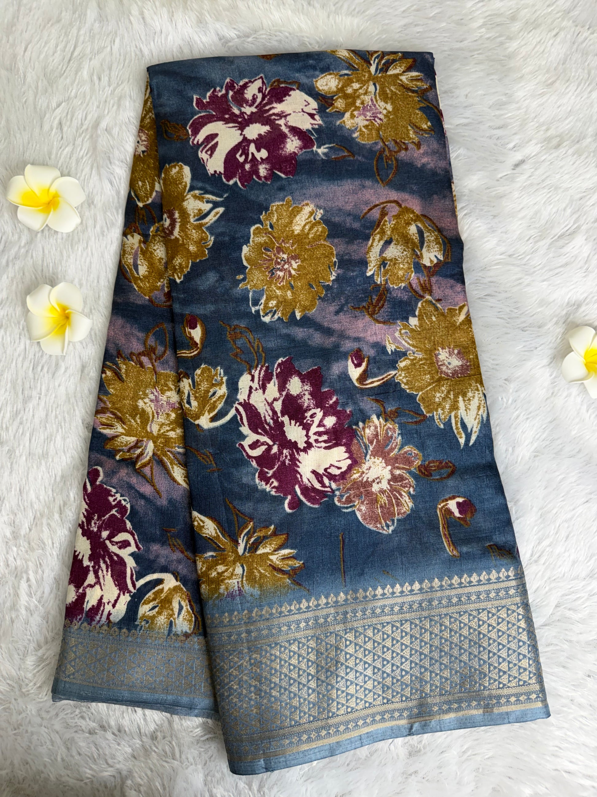 This saree is designed in rich Dola Silk with detailed floral prints and an enhanced woven border that adds depth and charm. With its smooth texture and elegant fall, it is perfect for festive gatherings, traditional functions, and special occasions.