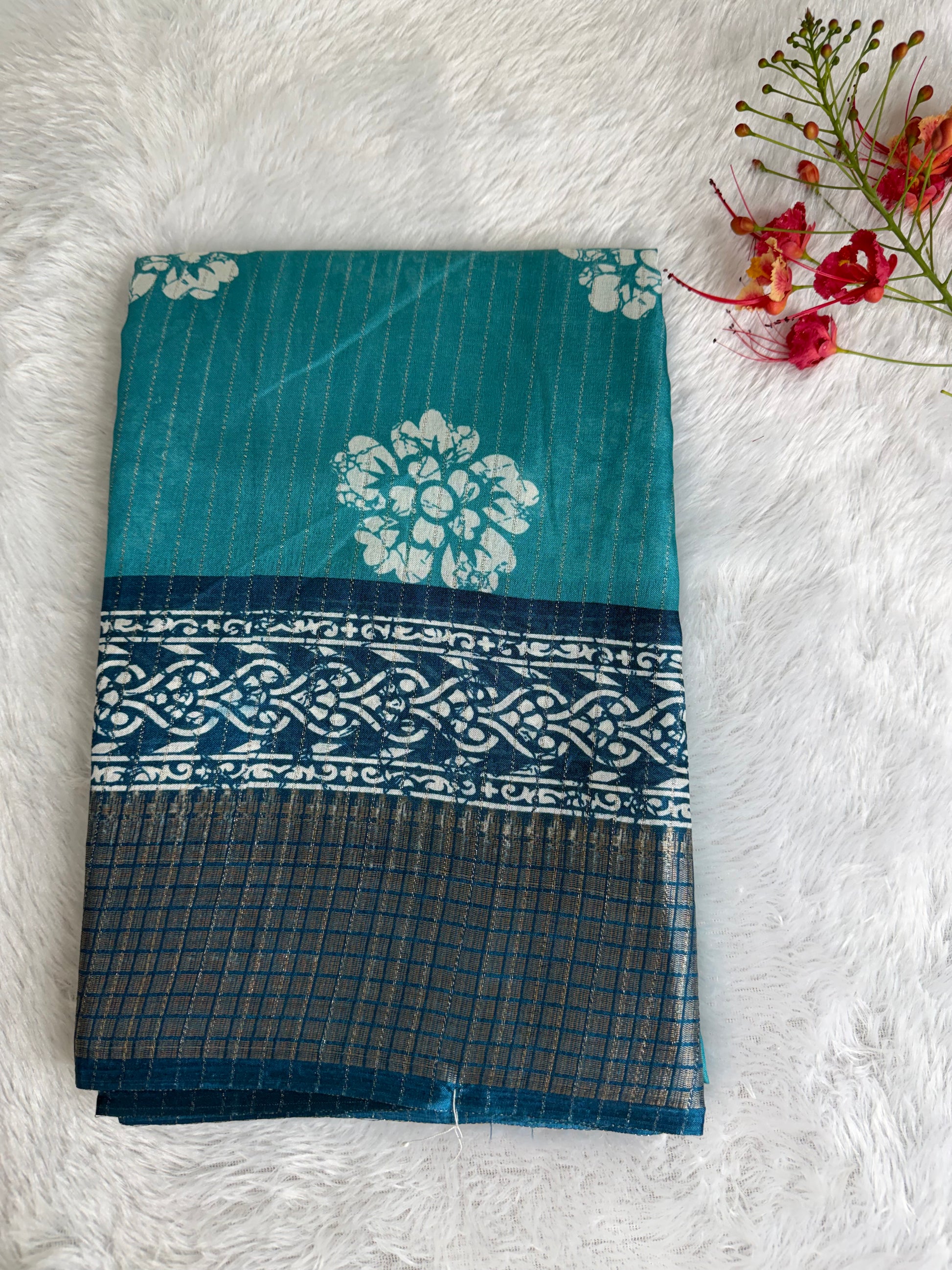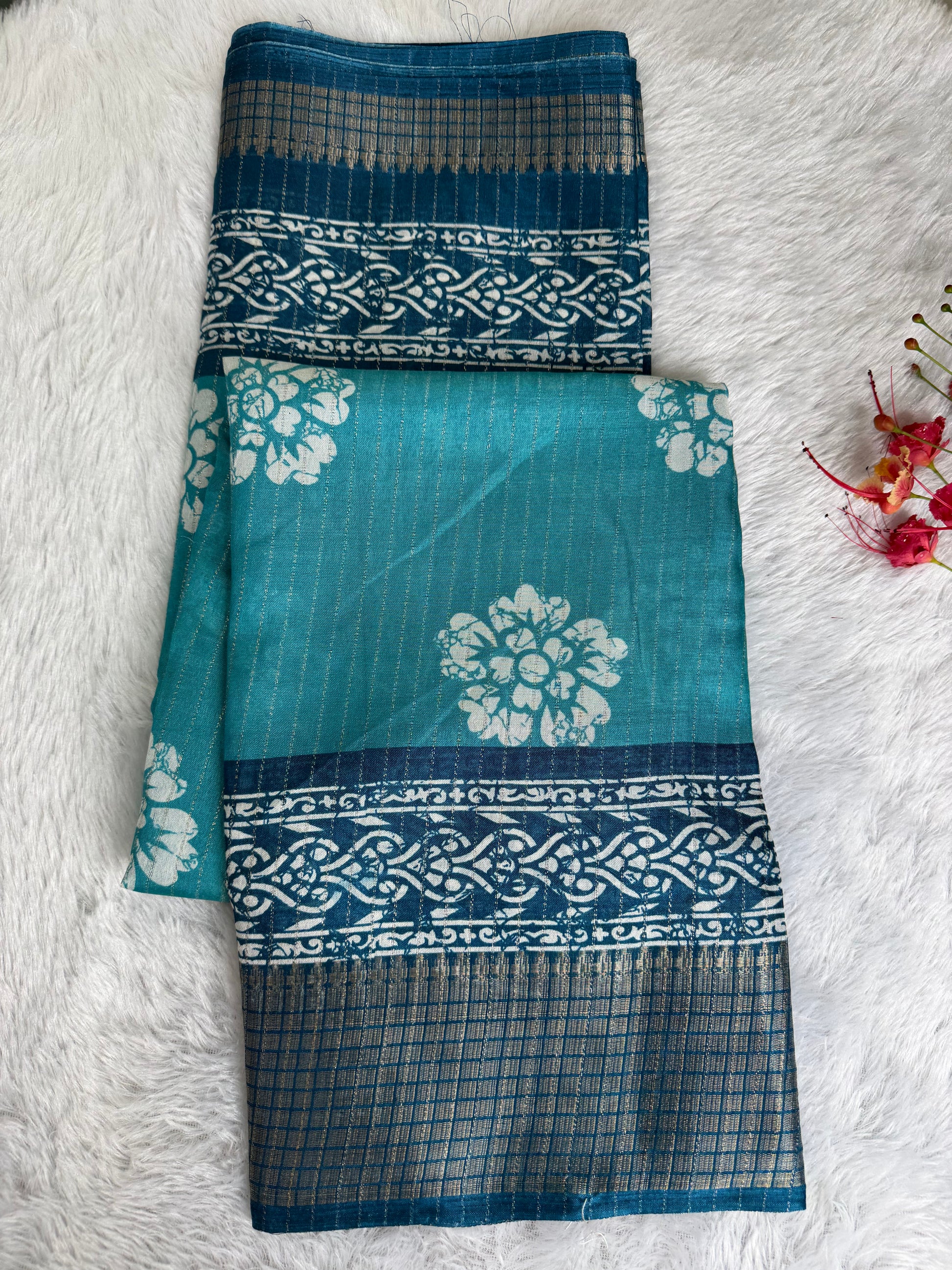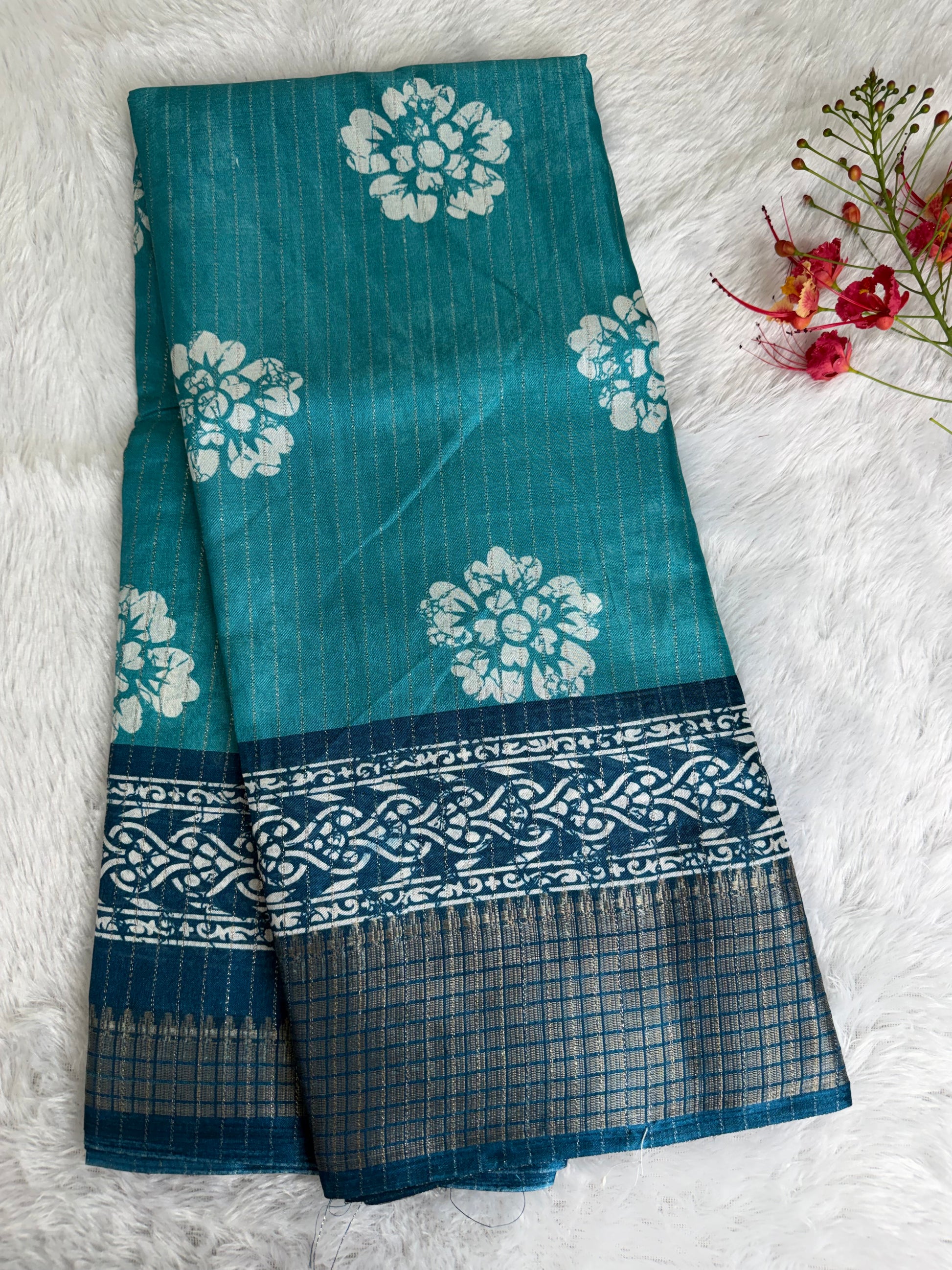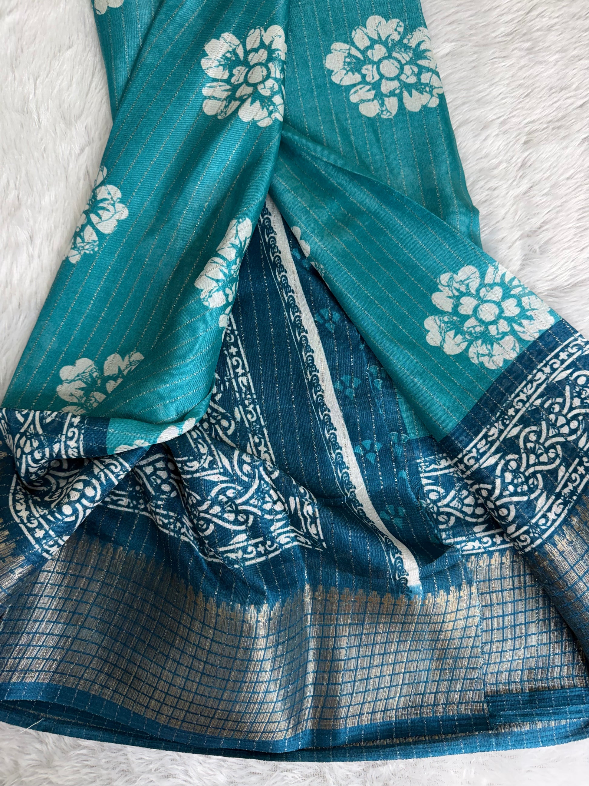 Crafted in premium Dola Silk, this saree features rich prints paired with a finely detailed, heavier woven border for a luxurious finish. The soft sheen and fluid drape enhance its elegant appeal, making it an excellent choice for festive wear, celebrations, and standout traditional looks.