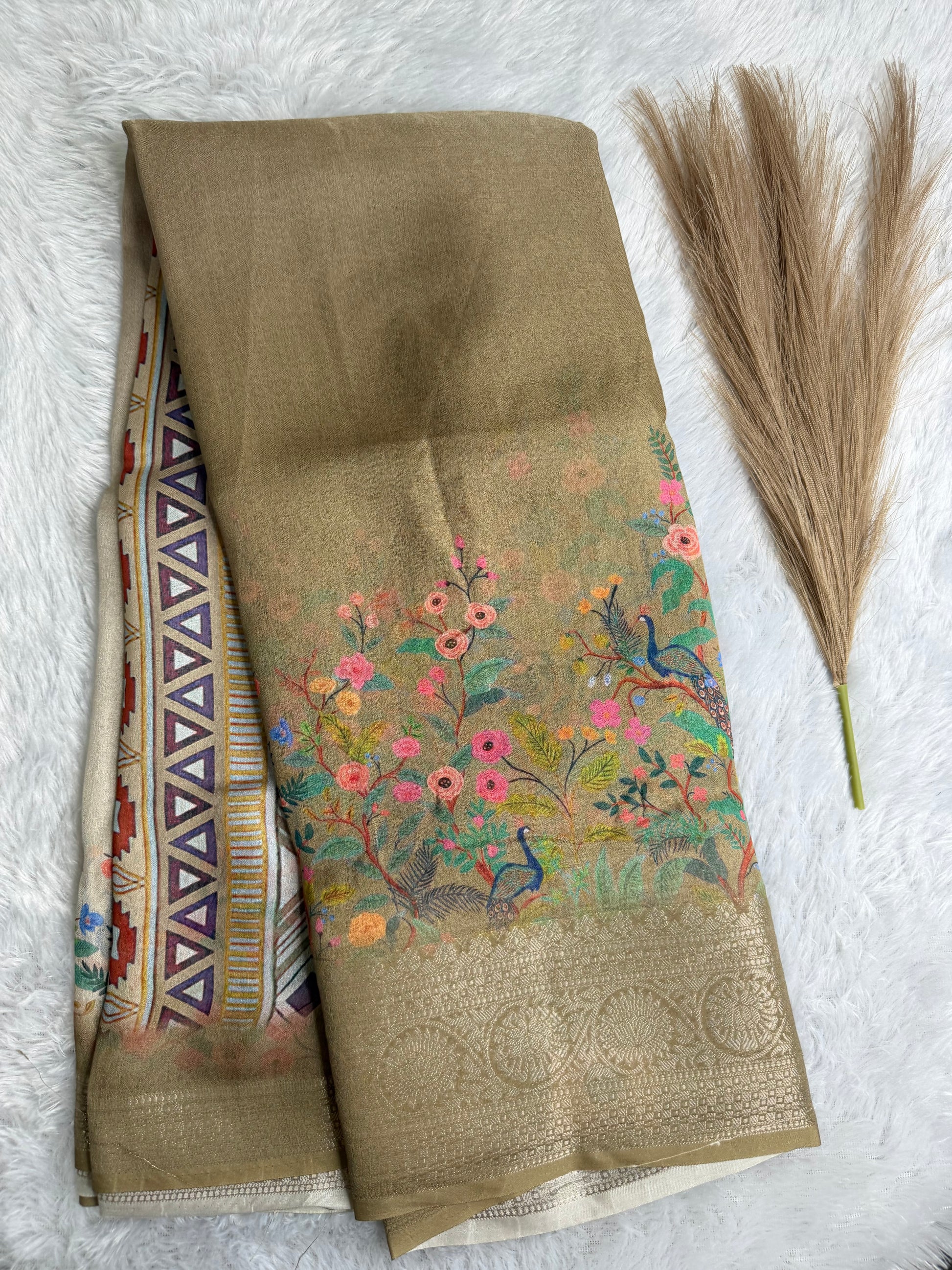 This saree is crafted in soft and lightweight Organza Silk, featuring elegant digital prints that create a graceful and airy appearance. The sheer texture with a subtle natural sheen gives it a refined, delicate look while maintaining a comfortable and effortless drape. Ideal for parties, festive occasions, and elegant day events where a light and sophisticated style is preferred.