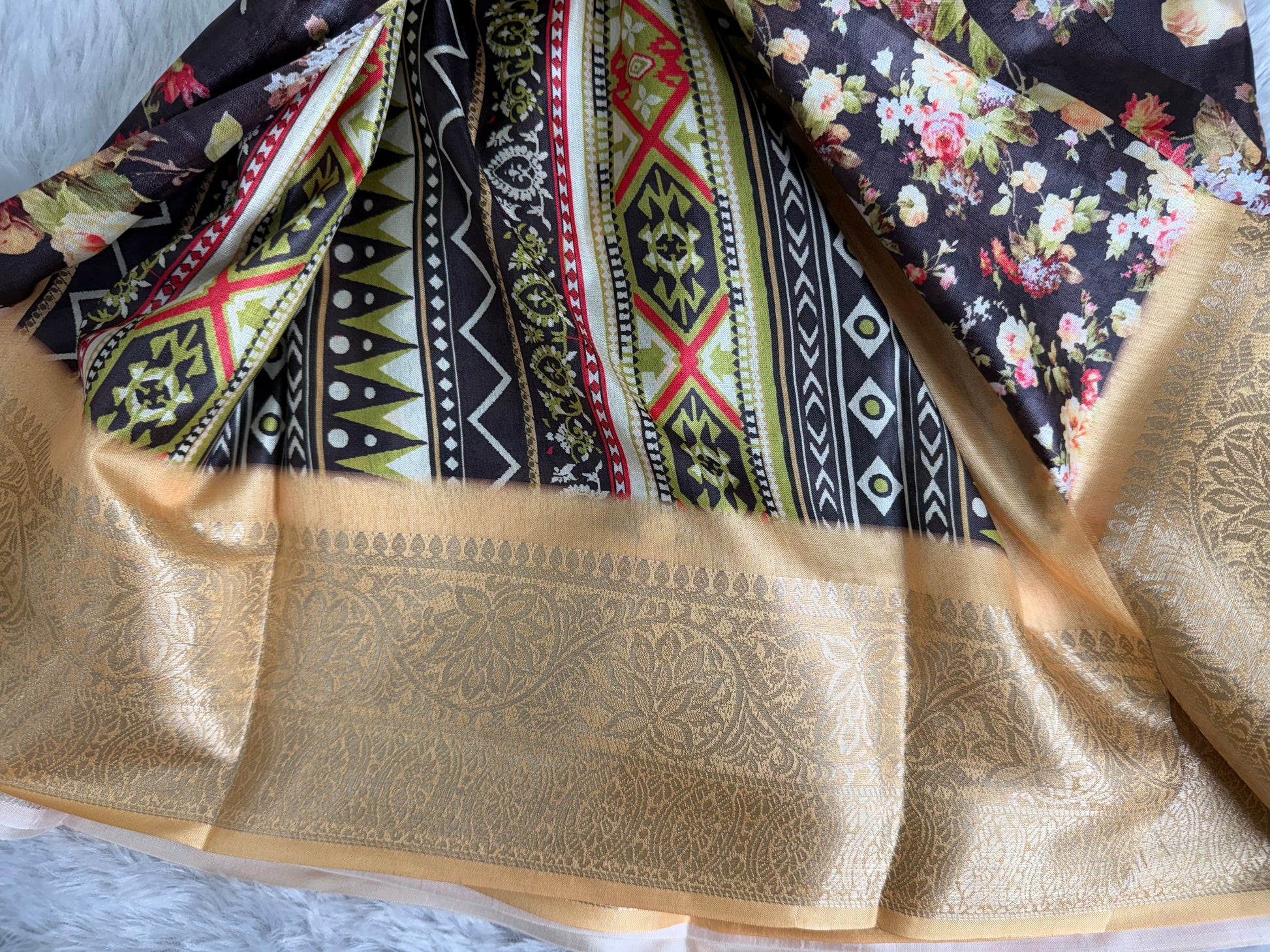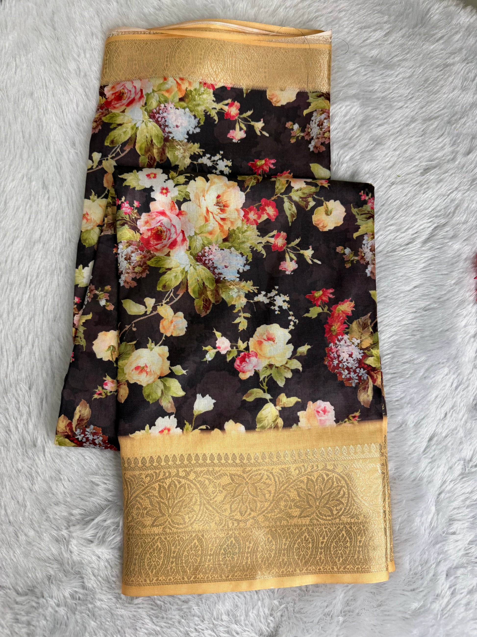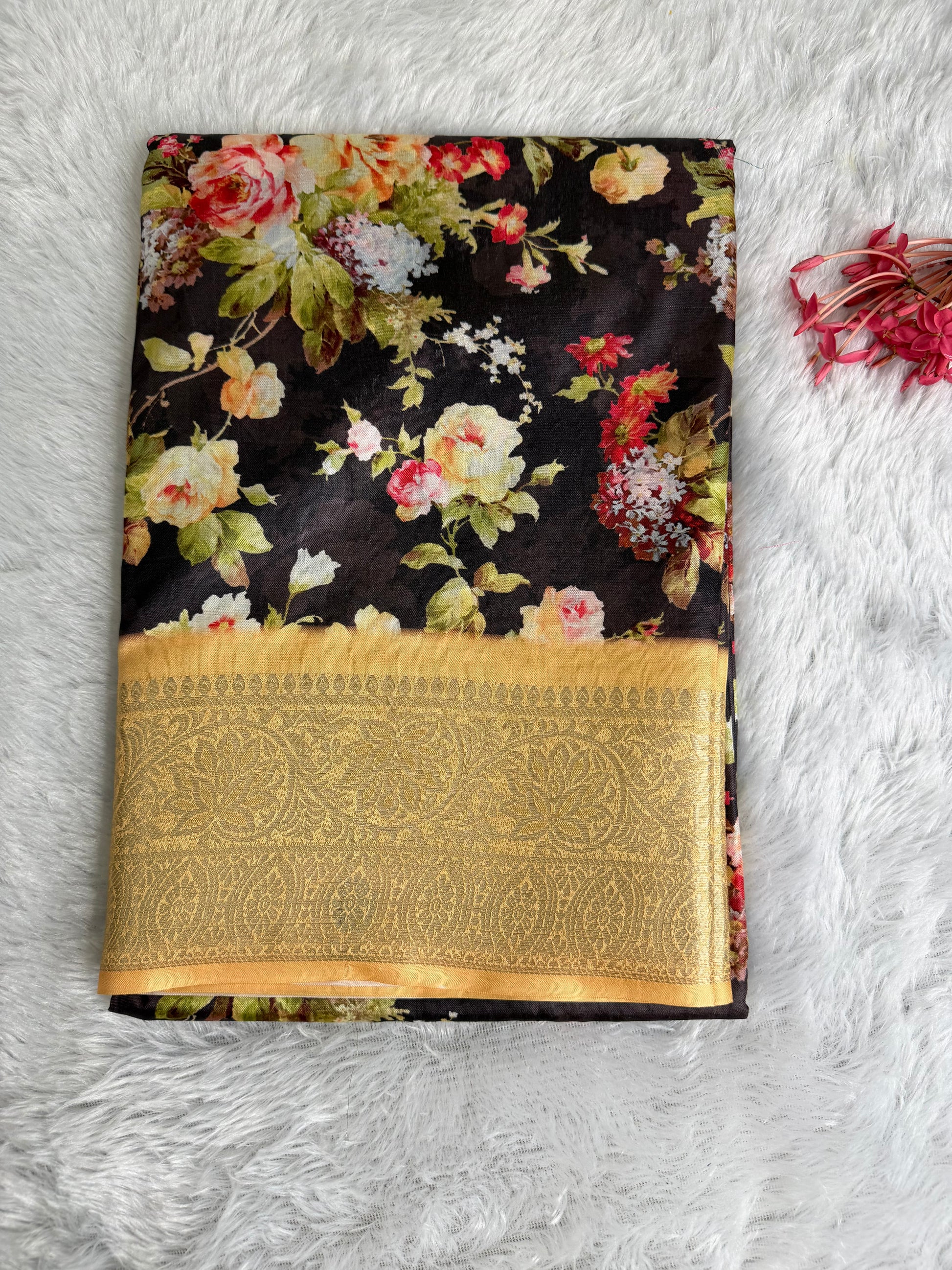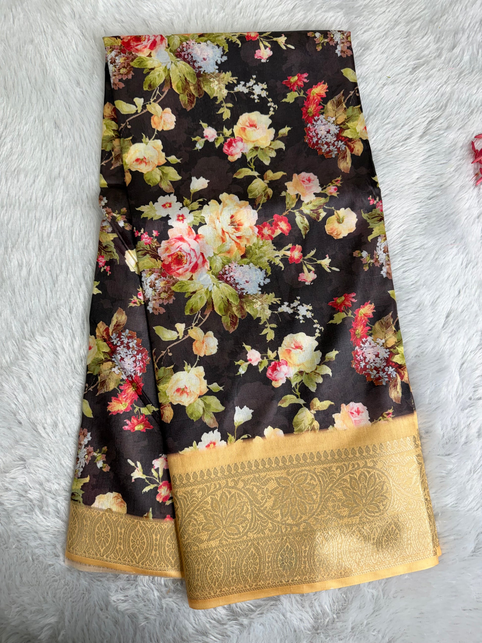 This saree is crafted in rich and smooth Soft Silk, featuring elegant floral prints across the body complemented by a beautifully woven traditional border. The fabric offers a soft texture with a graceful sheen and an excellent drape, giving it a refined and timeless appeal. Ideal for festive occasions, traditional functions, and elegant day wear.