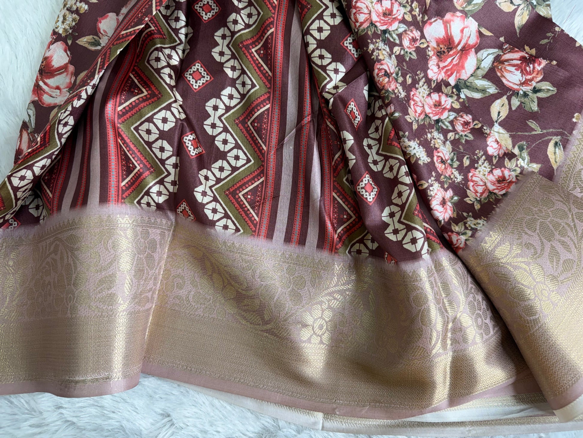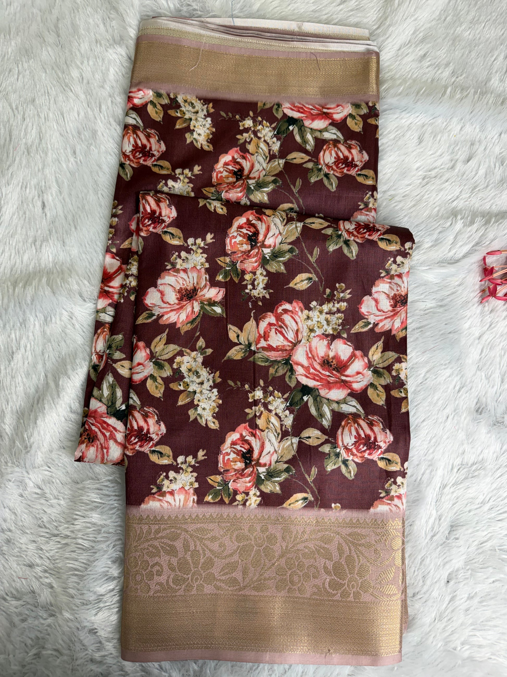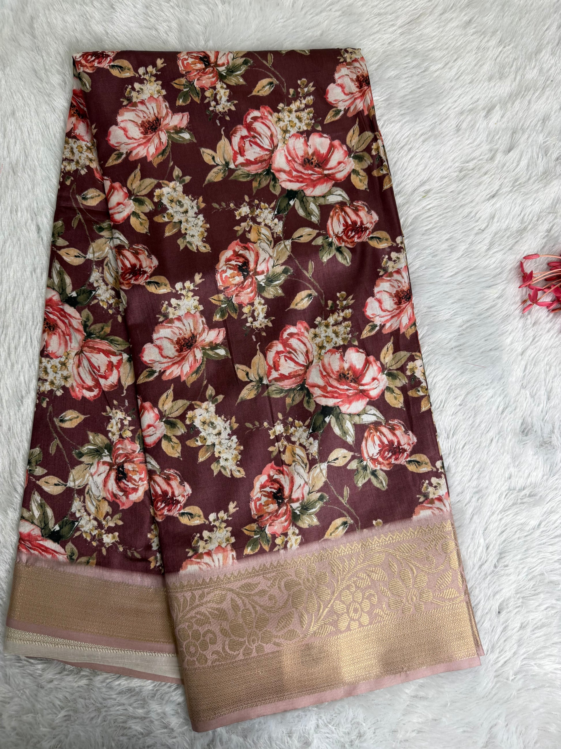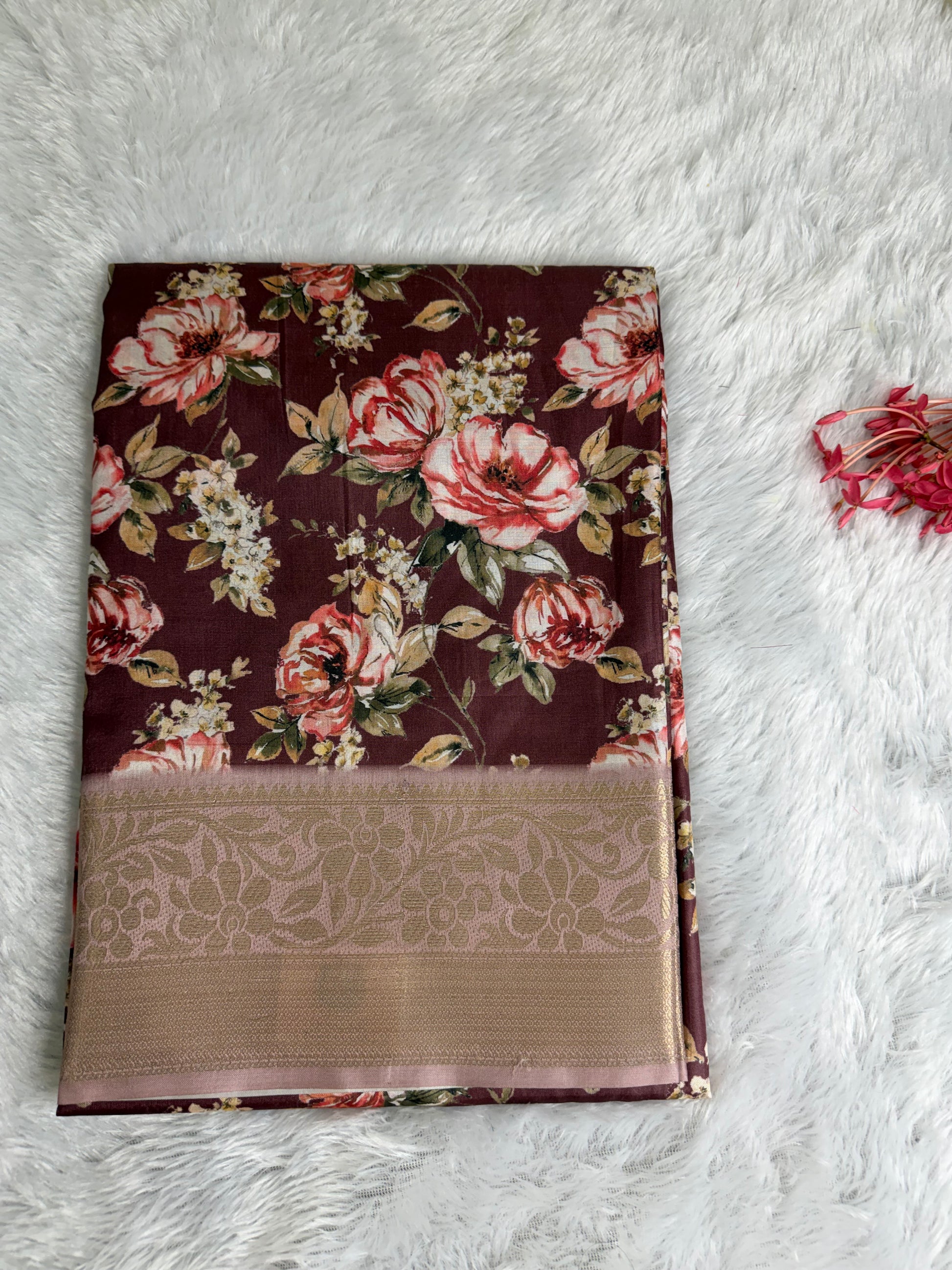 This saree is crafted in rich and smooth Soft Silk, featuring elegant floral prints across the body complemented by a beautifully woven traditional border. The fabric offers a soft texture with a graceful sheen and an excellent drape, giving it a refined and timeless appeal. Ideal for festive occasions, traditional functions, and elegant day wear.