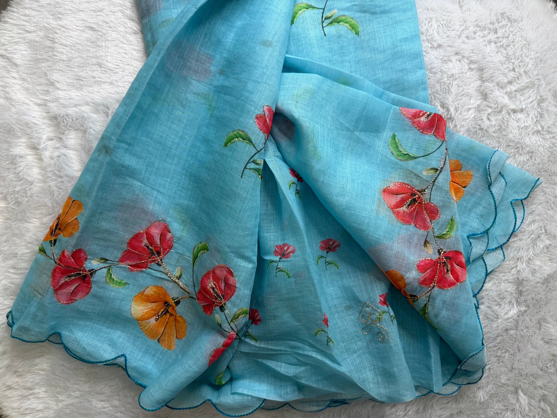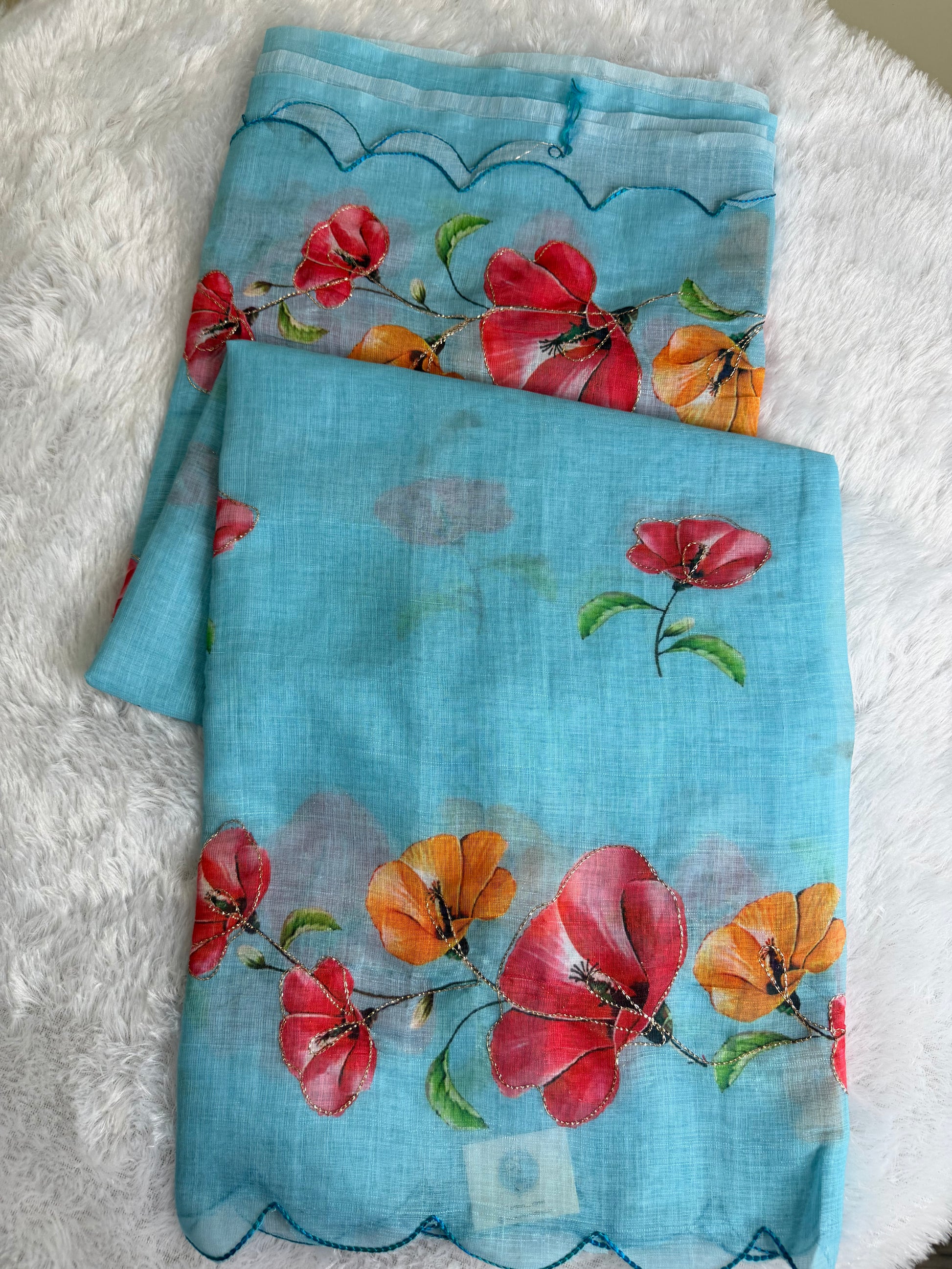 This saree is crafted in soft linen fabric, highlighted with elegant handcrafted cut work detailing. The subtle motifs add a refined artistic touch while the breathable texture ensures all-day comfort. Lightweight and graceful, this saree offers a perfect balance of tradition and simplicity, making it ideal for casual outings, office wear, and relaxed festive moments.