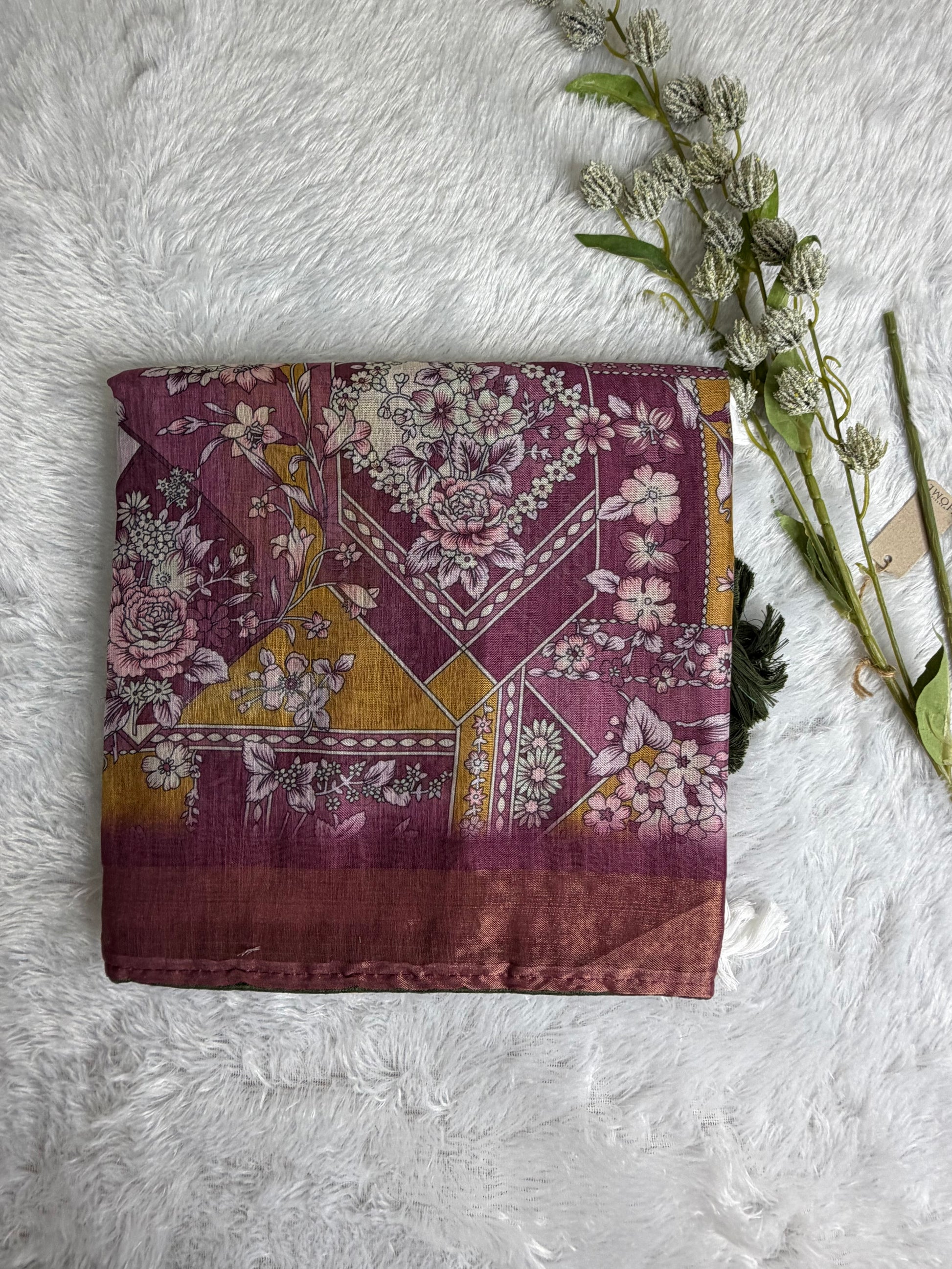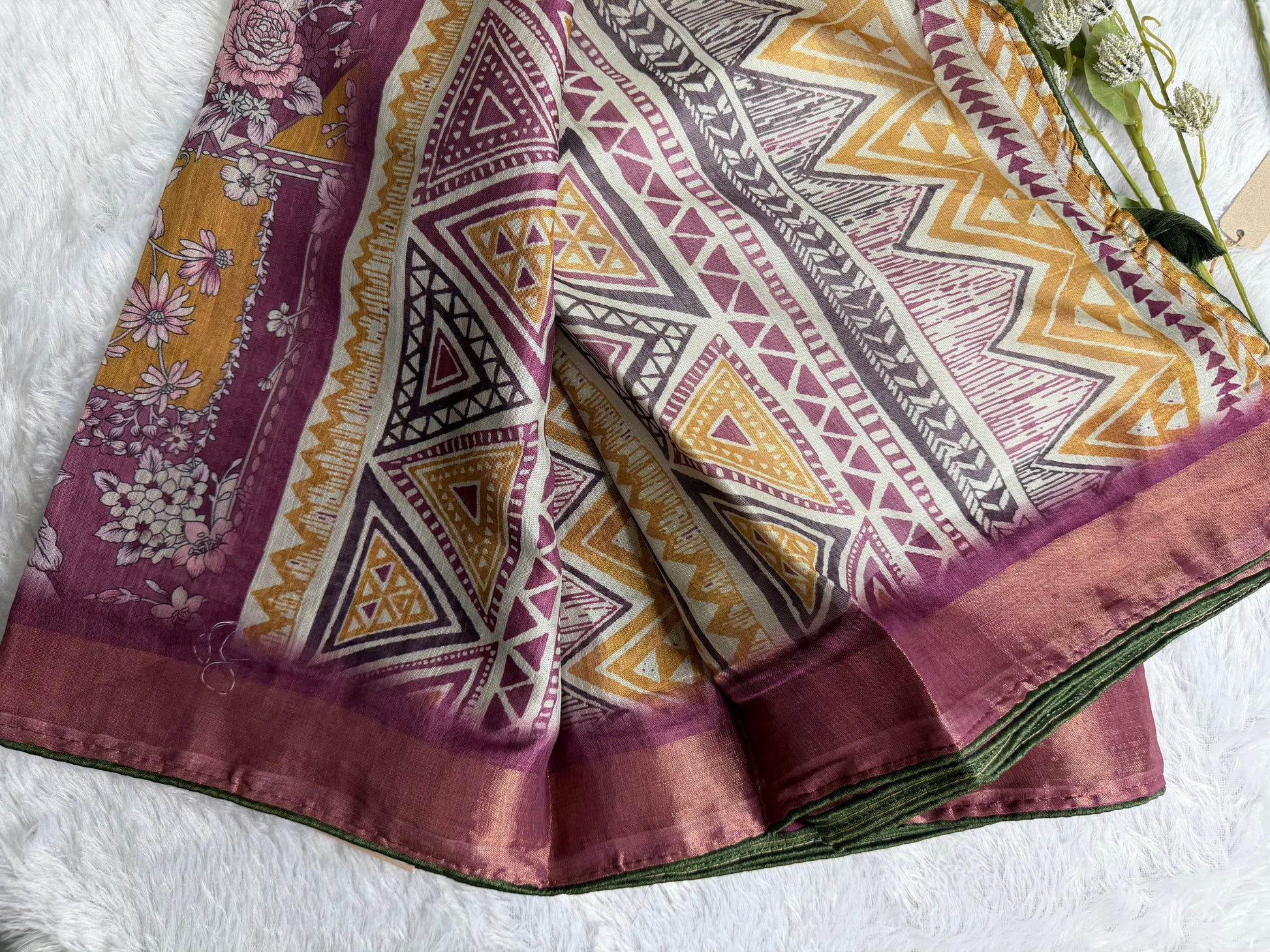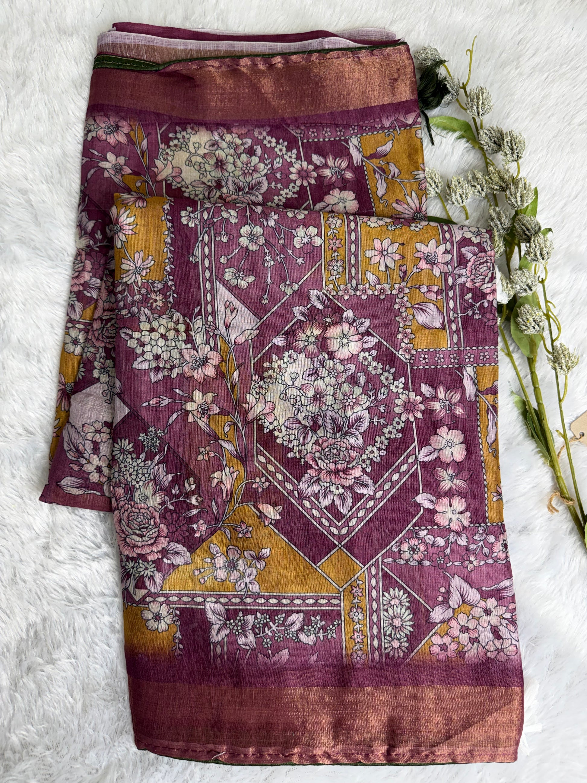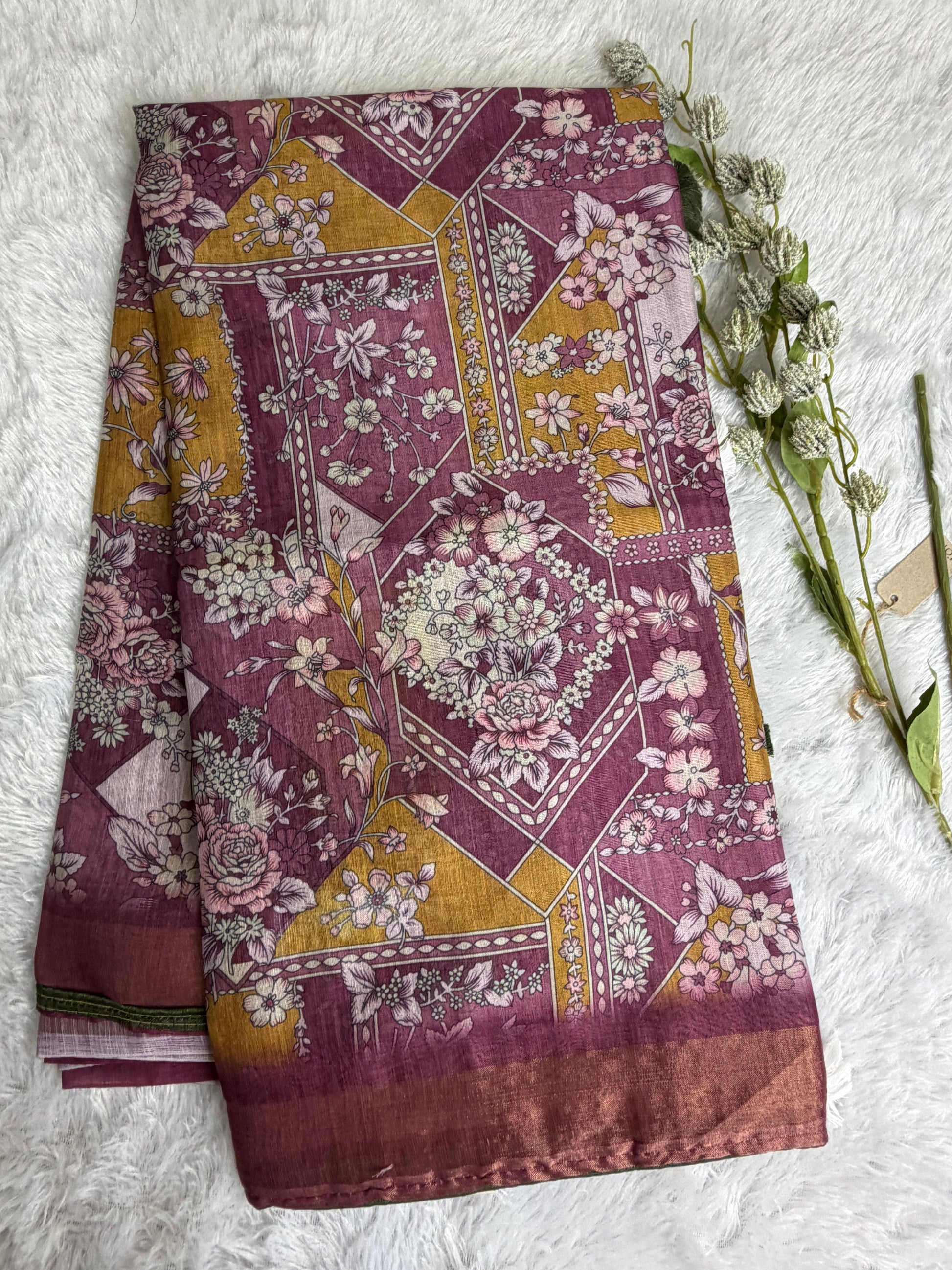 This saree is crafted in premium-quality Kota Linen, featuring elegant floral prints arranged in a refined geometric layout. Lightweight and breathable, the fabric offers a soft texture with a subtle natural sheen and a graceful drape. The contrast border enhances its sophisticated appeal, making it a perfect choice for office wear, casual gatherings, and elegant day occasions.