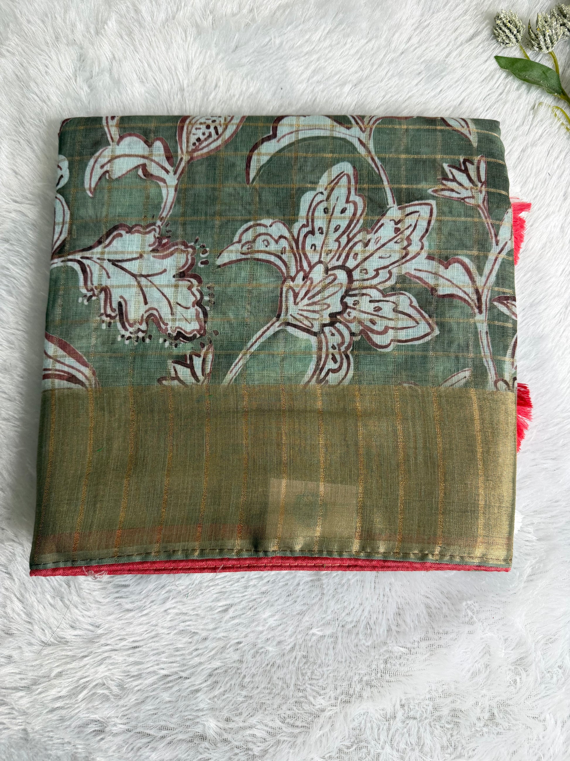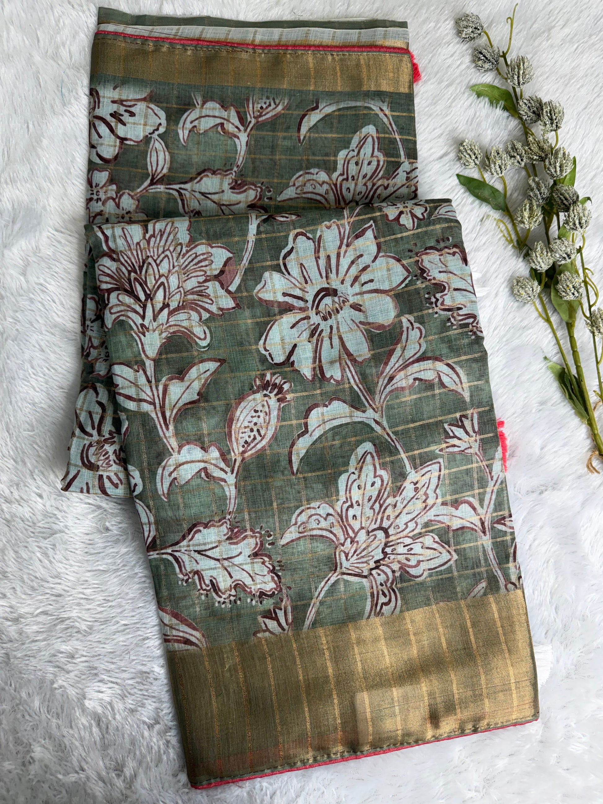 This saree is crafted in premium-quality Kota Linen, featuring elegant floral prints arranged in a refined geometric layout. Lightweight and breathable, the fabric offers a soft texture with a subtle natural sheen and a graceful drape. The contrast border enhances its sophisticated appeal, making it a perfect choice for office wear, casual gatherings, and elegant day occasions.