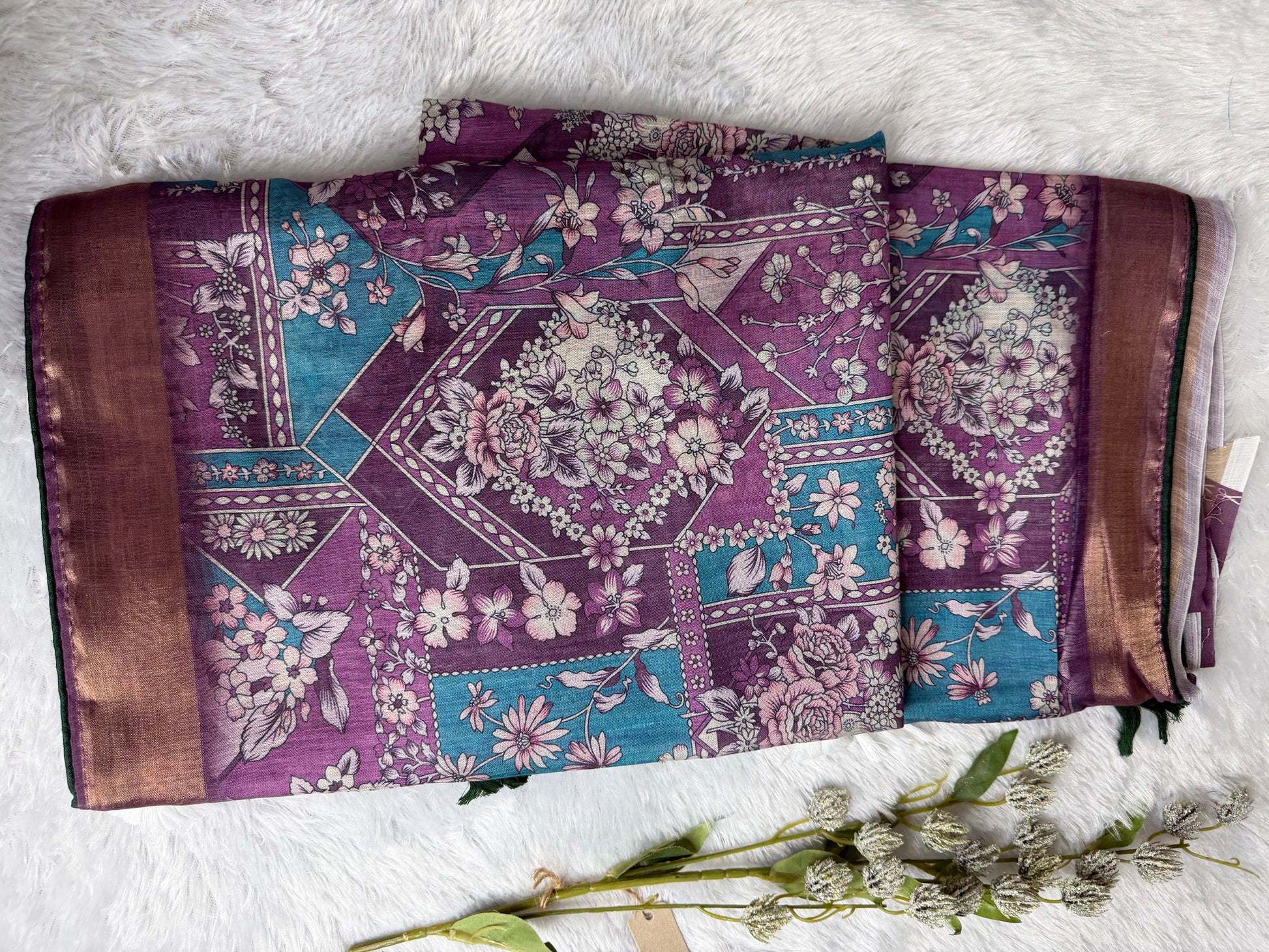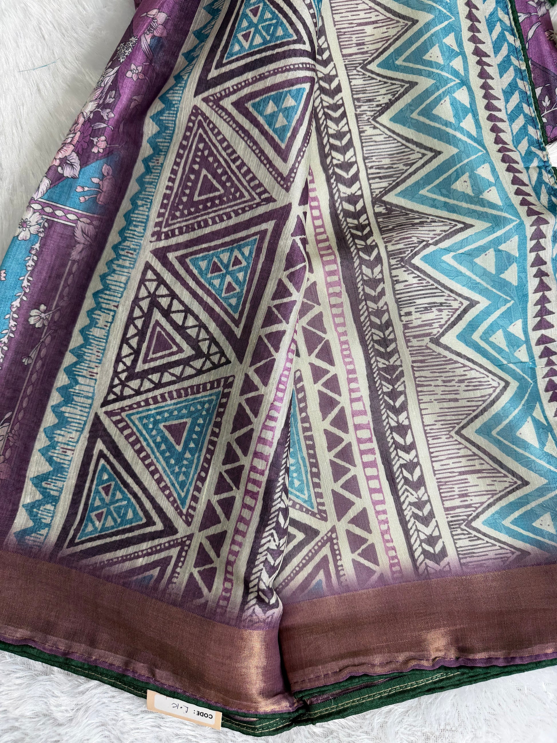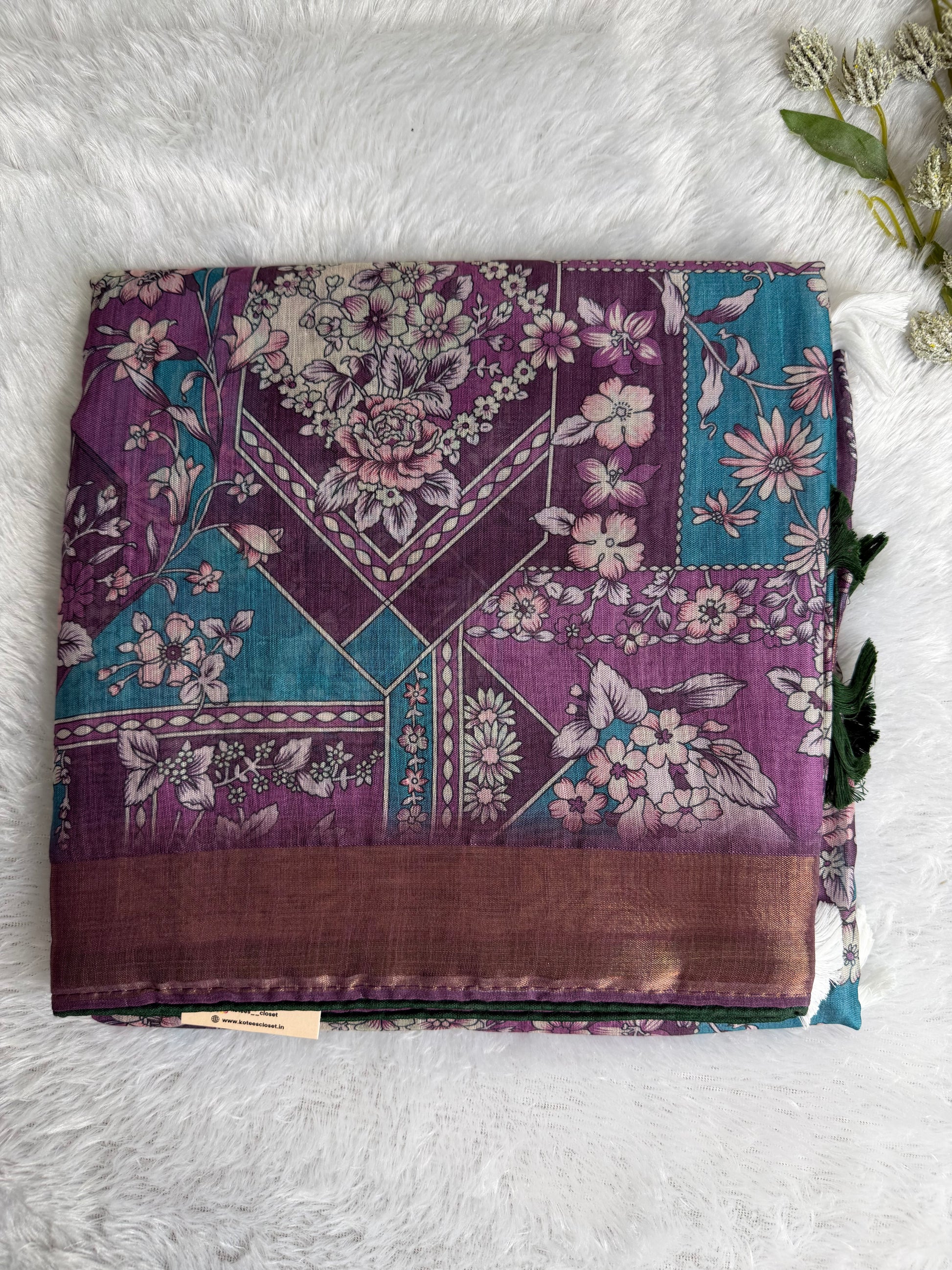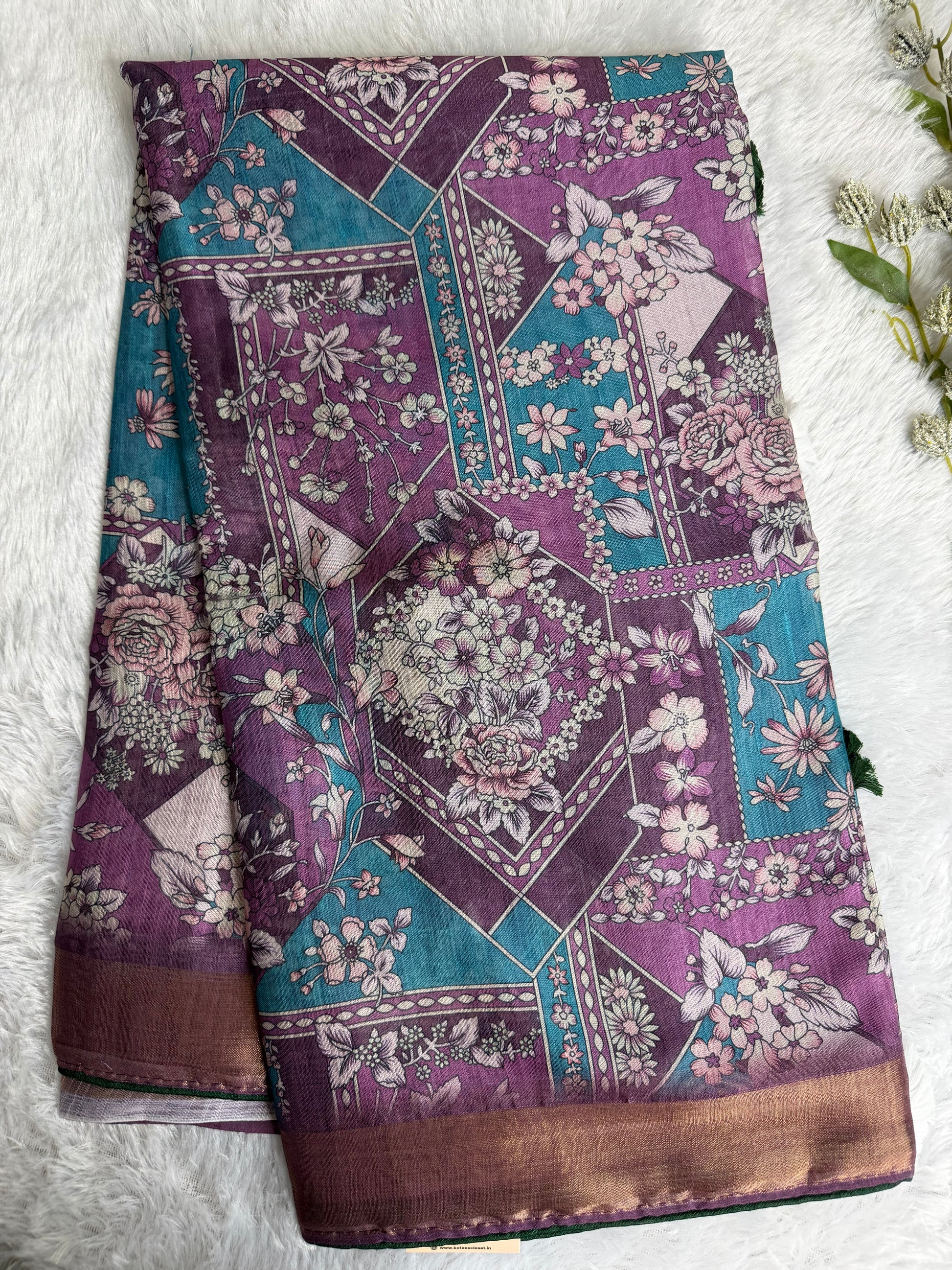 This saree is crafted in premium-quality Kota Linen, featuring elegant floral prints arranged in a refined geometric layout. Lightweight and breathable, the fabric offers a soft texture with a subtle natural sheen and a graceful drape. The contrast border enhances its sophisticated appeal, making it a perfect choice for office wear, casual gatherings, and elegant day occasions.